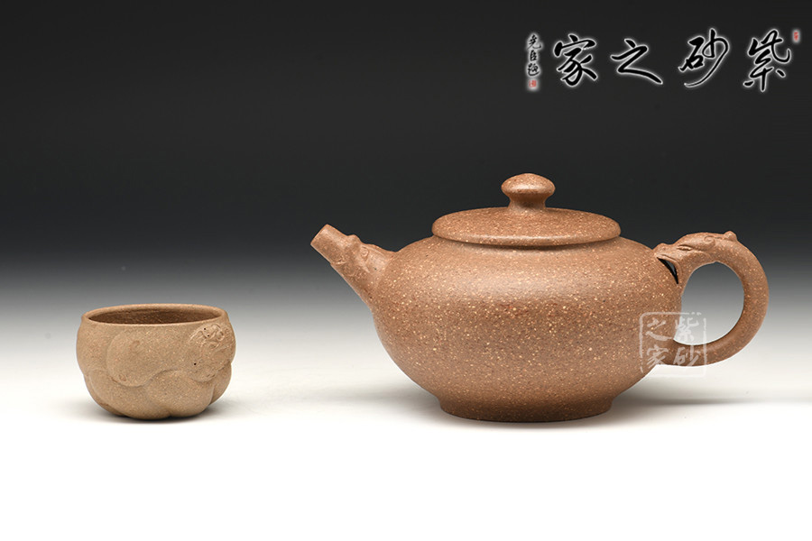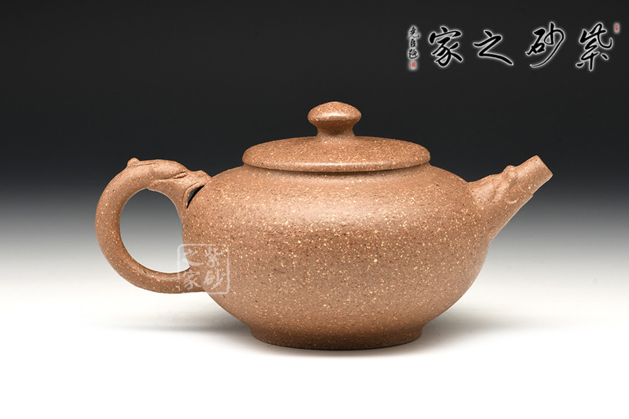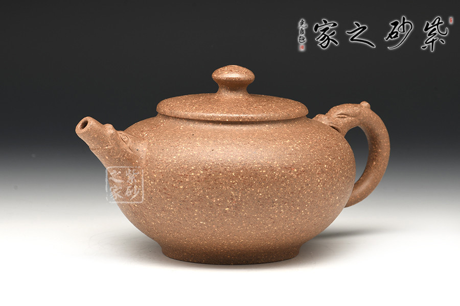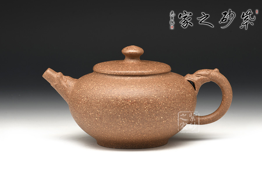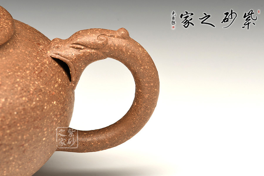 扁圓壺身,“龍吐水”形直嘴流,順暢有力;點睛之處在于其把,有別于一般的簡單龍尾把,而是上部連接處以龍嘴大張、長吟的動作來展現(xiàn),觀其大嘴,似乎可聞那驚人的嘯吼,視覺及聽覺沖擊力明顯。