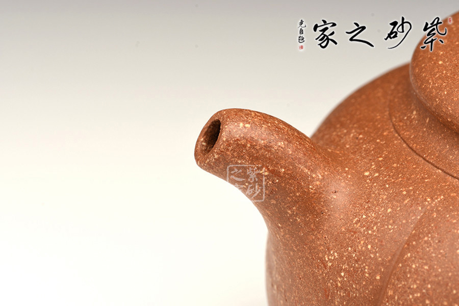 特點:原礦因含緞泥、紅泥、紫泥等諸多共生礦,陶之后,于深沉之“橙紅色”底上,滿佈五彩斑斕的粗細(xì)、深淺之紅、黃星斑點。