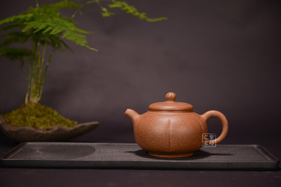 俯視全壺,則被等分,利用從頸部到壺底的凹線均勻劃分,筋脈清晰、深淺自如。平蓋壓口,嚴(yán)絲合縫,貯茶密閉不滲水,開合順暢自在。以一小圓菊球為鈕,采用筋紋裝飾,儼然壺身的縮小版,觀之小巧可愛,憐愛之心油然而生。一彎嘴線條流暢,耳形把彎曲有度,提攜傾倒極為順手。全壺簡約不失氣質(zhì),可愛之中不乏靈動。