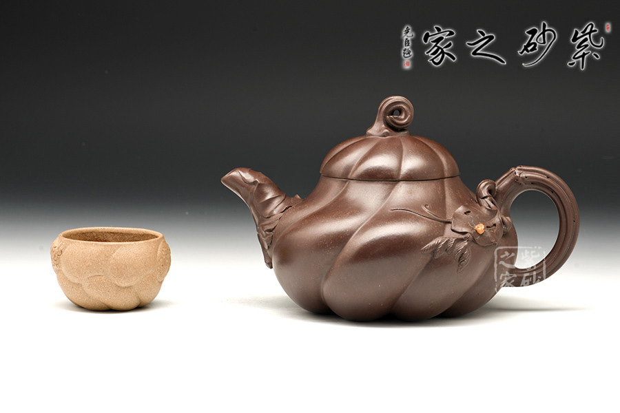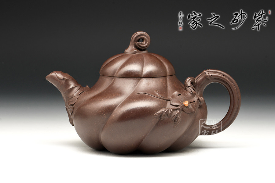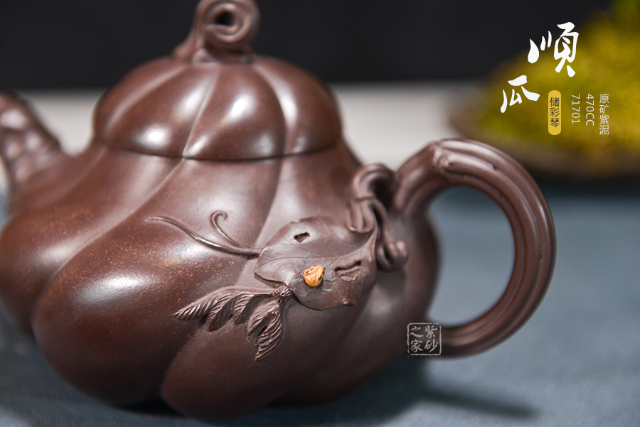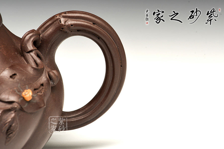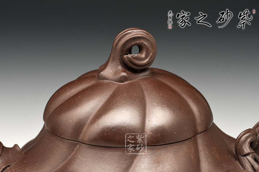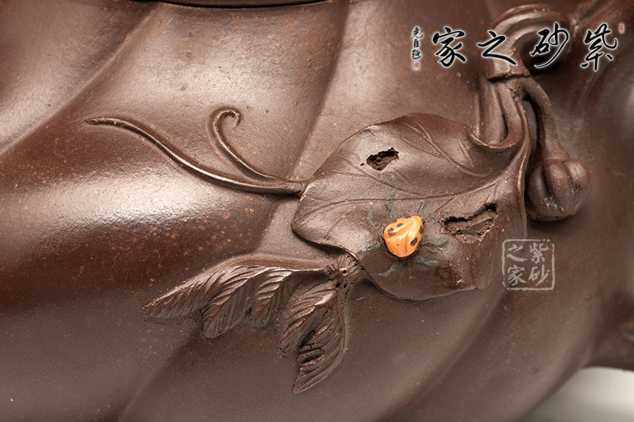 此南瓜不僅外形酷似南瓜,更是集聚了南瓜的神韻,猶若瓜熟即將待落。將南瓜藤蔓作為壺把、壺鈕,南瓜葉裹挾成壺嘴,一片南瓜葉子覆蓋在“南瓜”上,其上爬一只瓢蟲,無論從葉子的形態(tài)亦或是卷曲皺褶都處理的一絲不茍,處處彰顯出做功之精妙。