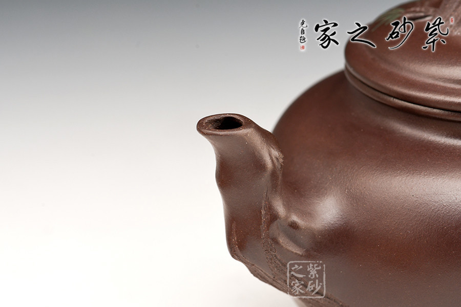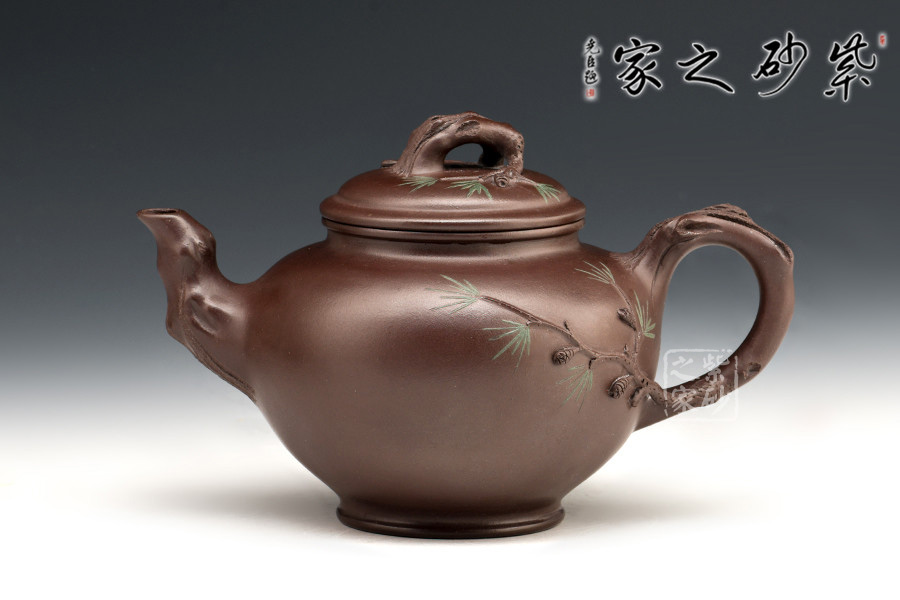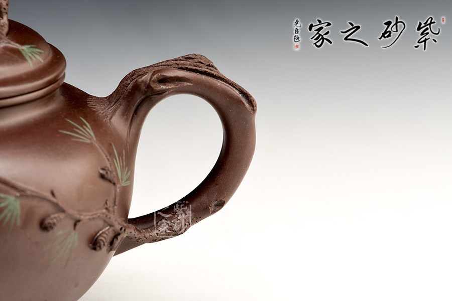 松報春壺以松為造型裝飾的壺體,壺身為圓形,壺鈕、壺把、壺嘴以樹木枝干為形,壺身上又作松針、松果等造型的雕塑,來顯示報春壺的表現(xiàn)形態(tài),代表萬物復(fù)蘇,生機盎然的春天美景。因此,報春壺受到文人雅士的喜愛。