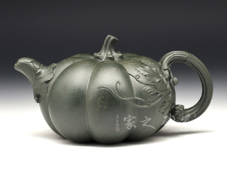 此作以瓜體為身,瓜蒂為鈕,藤為流把,壺身貼塑莖、須、葉,紋絡(luò)逼真細(xì)致,瓜棱勻稱飽滿,蓋與身上下貫通,弧線優(yōu)美,和諧自然。