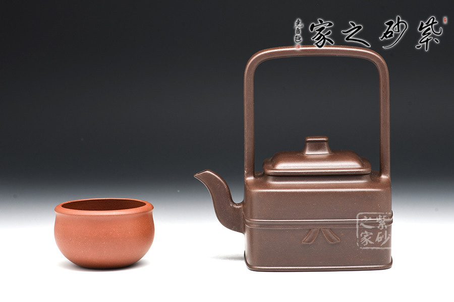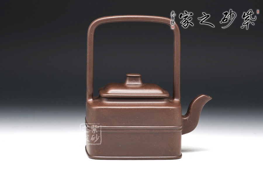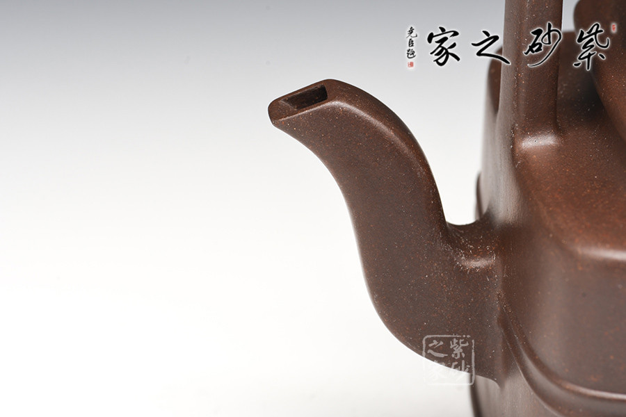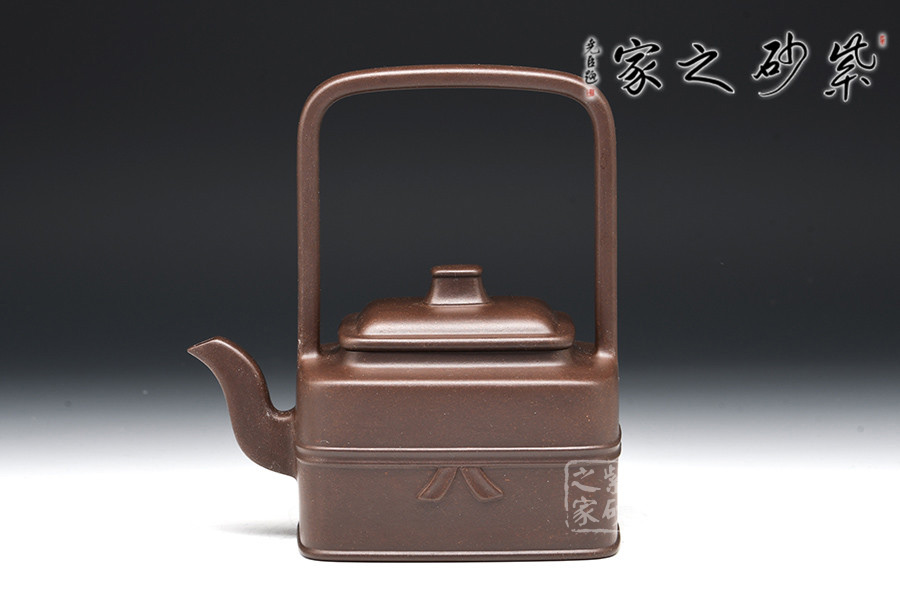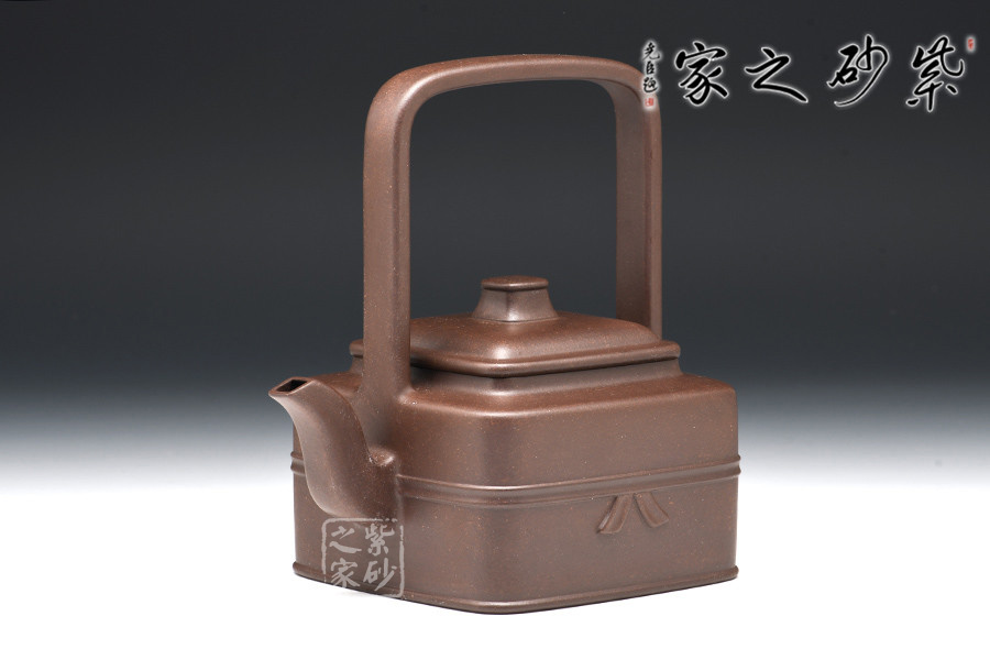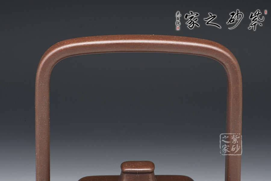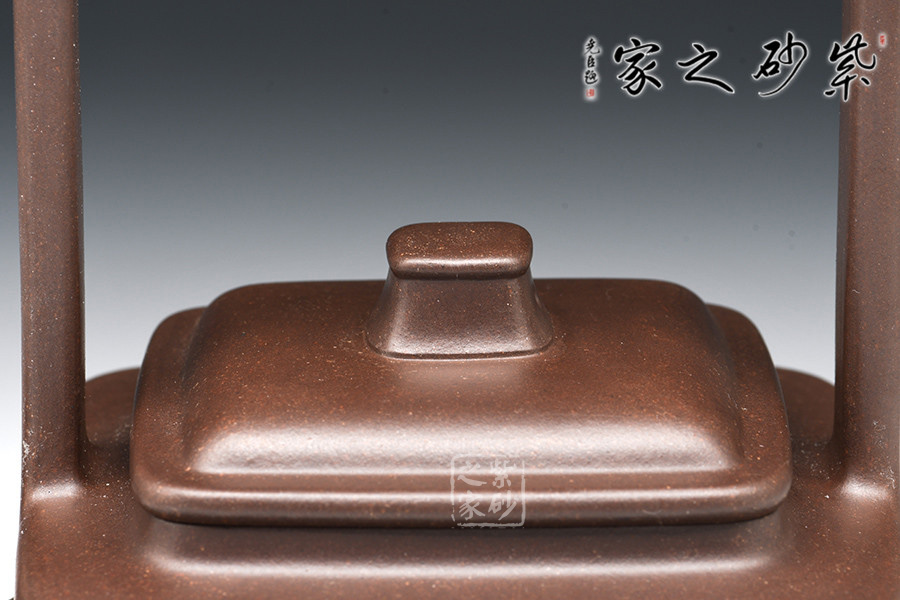 此器四方寓圓,壺做平底,成虛懷若谷之勢(shì)。壺鈕作圓柱型,與壺身呼應(yīng),和諧韻致。提梁壺把,成型難度高,增添了空間感。