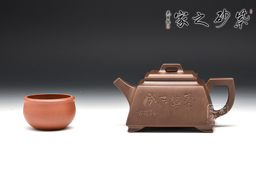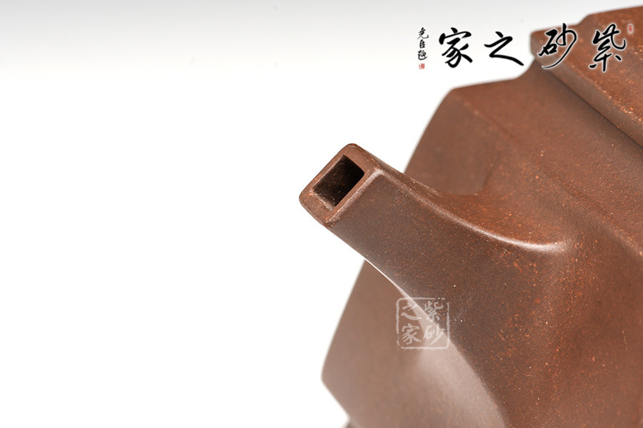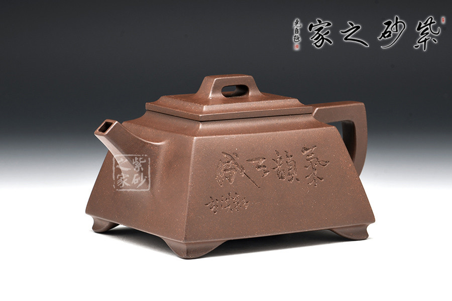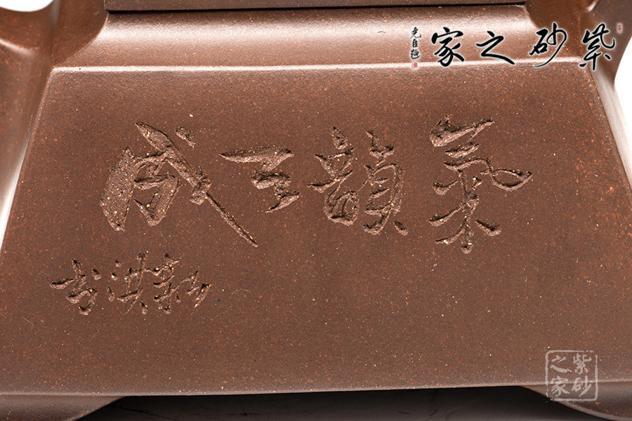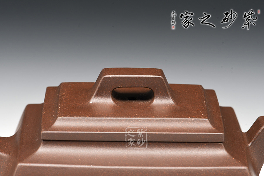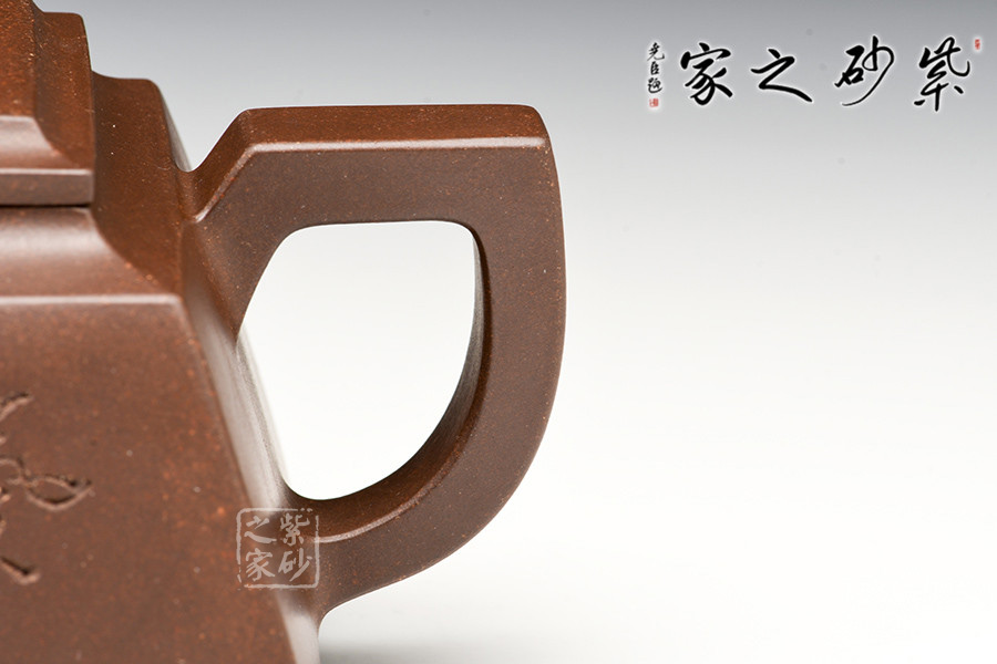 壺體造型方體,型制方正,平蓋橋形鈕,短直流,方圈把。整體造型比例協(xié)調(diào),棱角分明,給人以挺拔硬朗的氣勢,于穩(wěn)健中見大氣度。