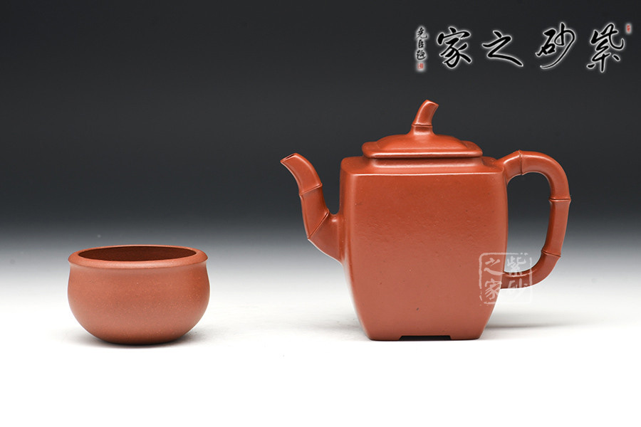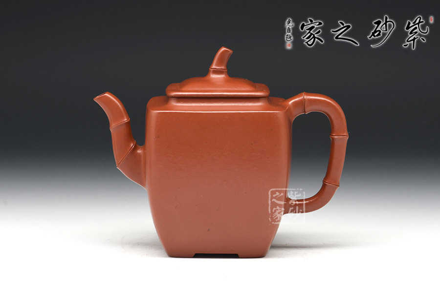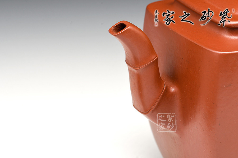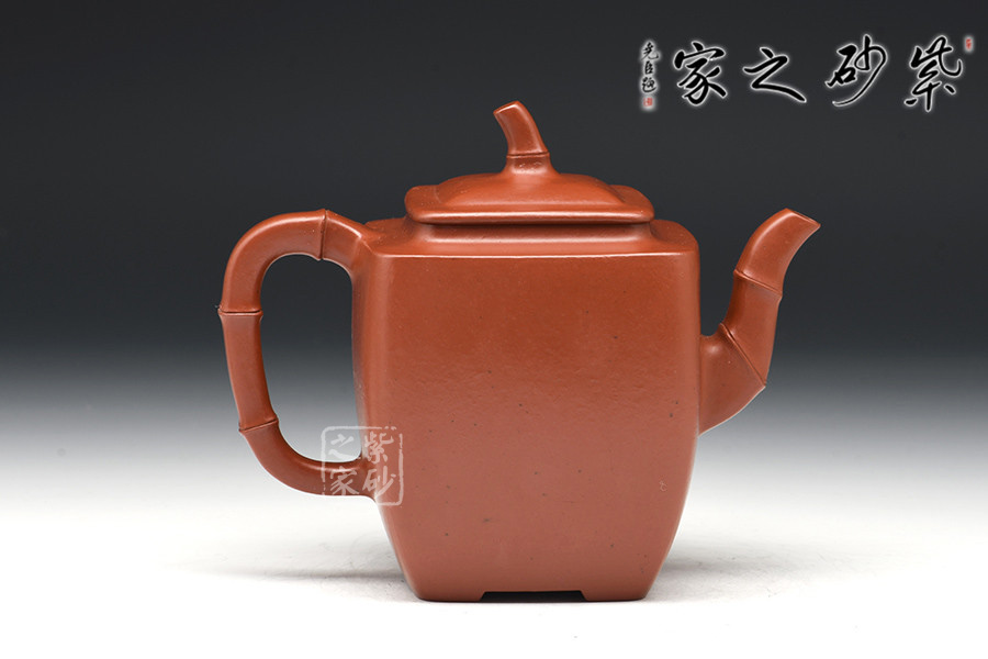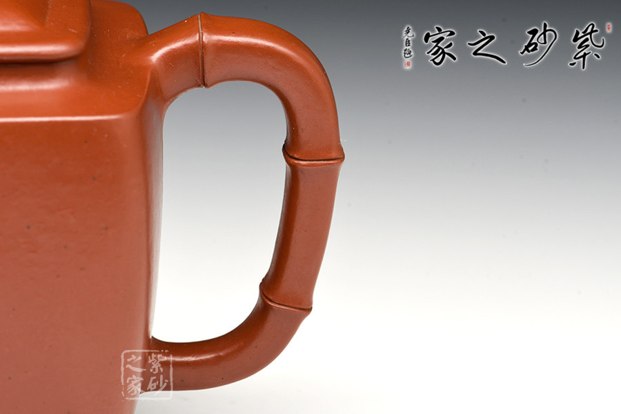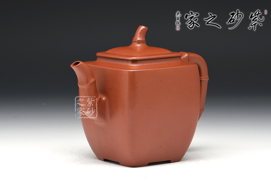 壺身以高四方為體,直而粗壯,壺嘴、壺鈕、壺把均以竹段造型,清秀自然,挺拔高雅,竹以清高著稱,壺更有雅潔之態(tài)。