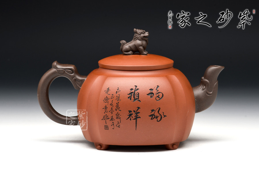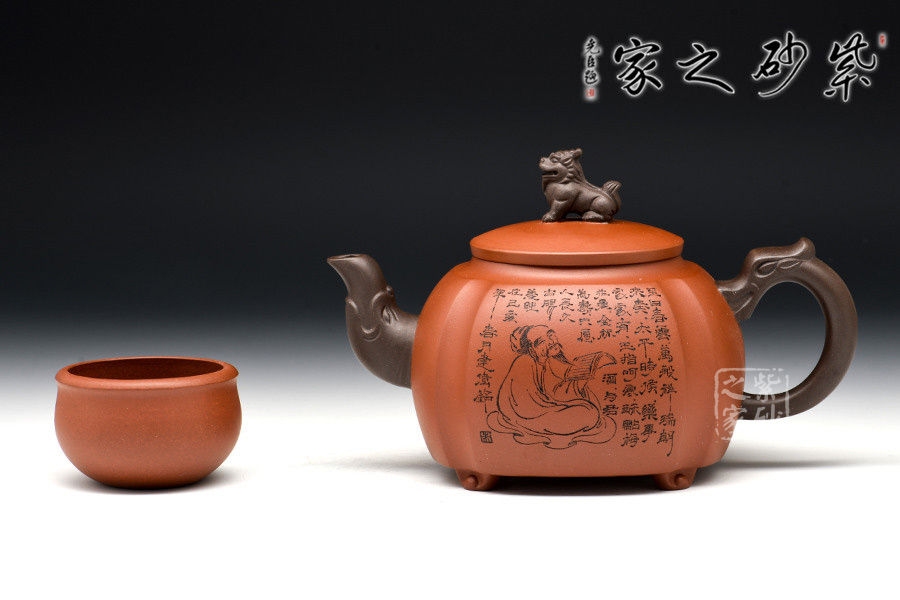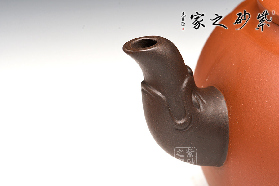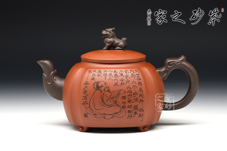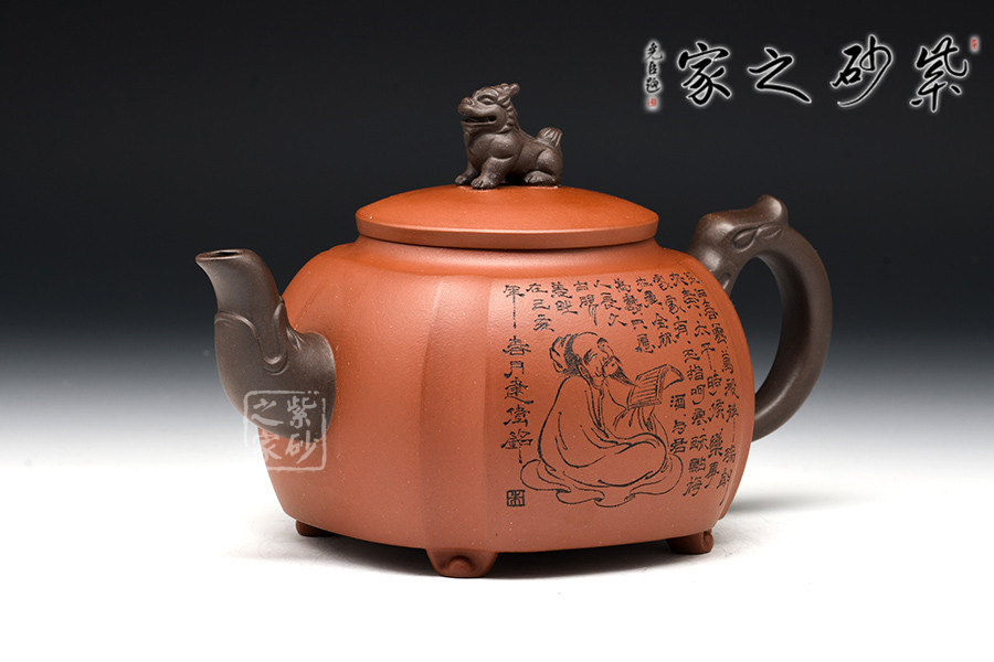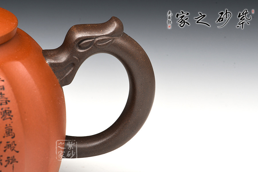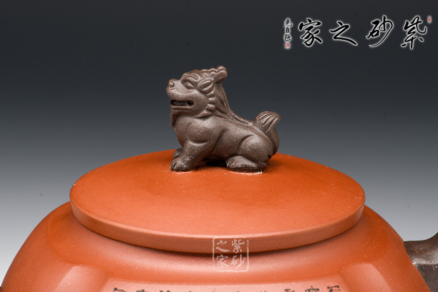 此作除陶刻及雙色泥的手法亮點(diǎn)之外,引人注目的還有流把處的龍形英姿,以及獅子形的壺鈕,精雕細(xì)刻,展霸氣風(fēng)范。