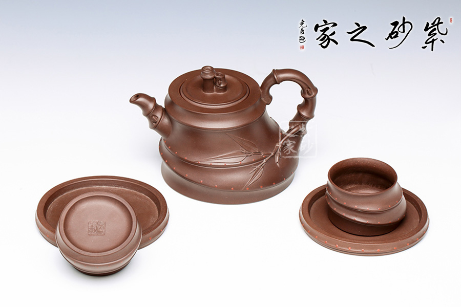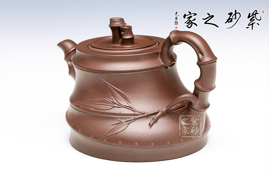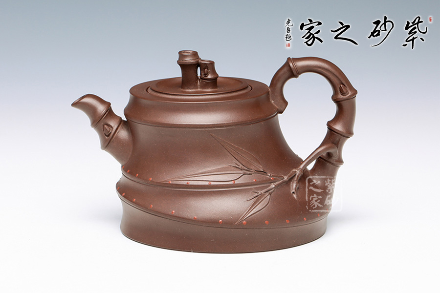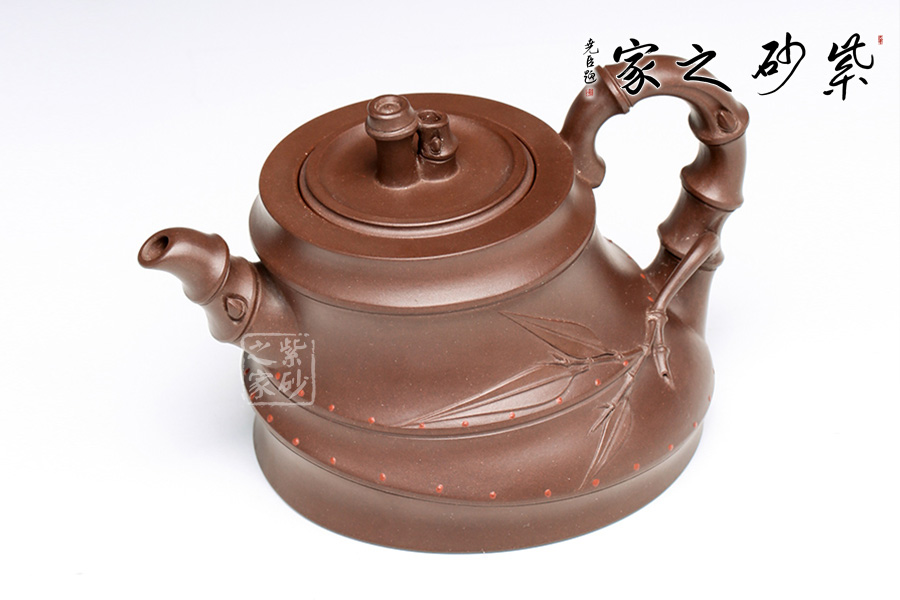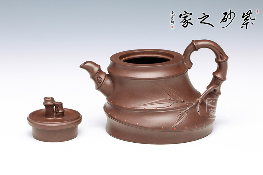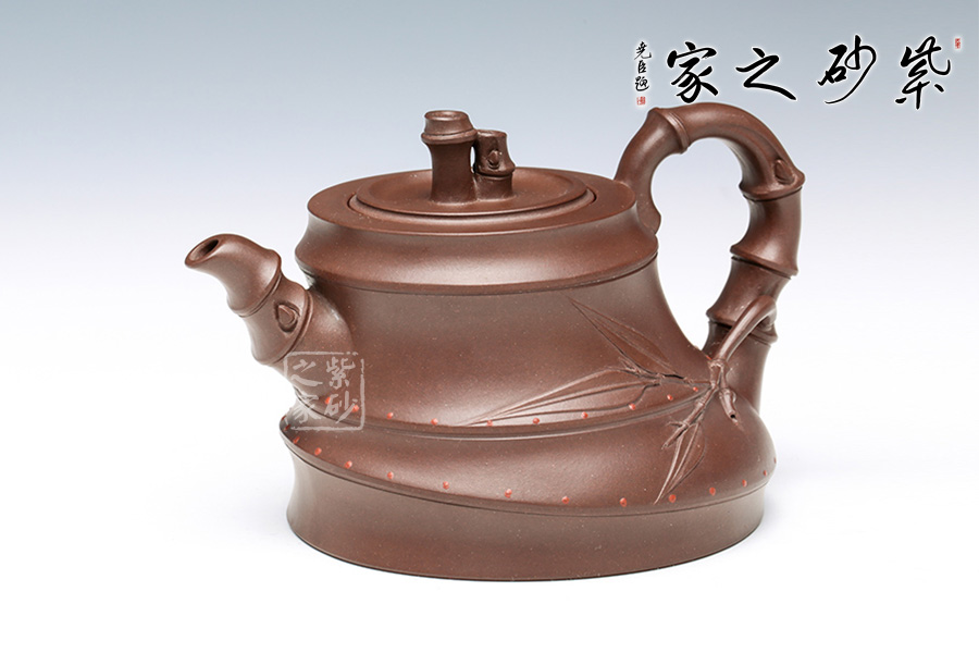 兩枝小竹為蓋的清秀可人,流與壺身略向前傾,夸張的彎把則使連續(xù)變化的造型取得平衡與統(tǒng)一。壺腹竹葉的裝飾布置更有畫(huà)龍點(diǎn)睛之妙。