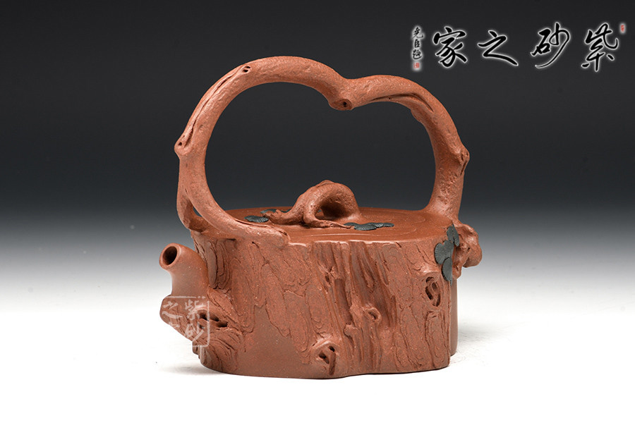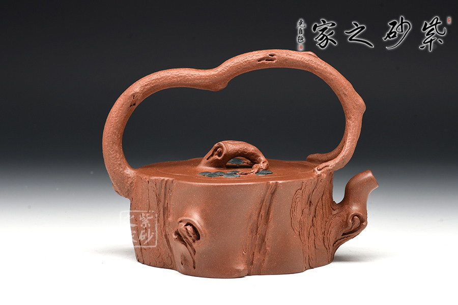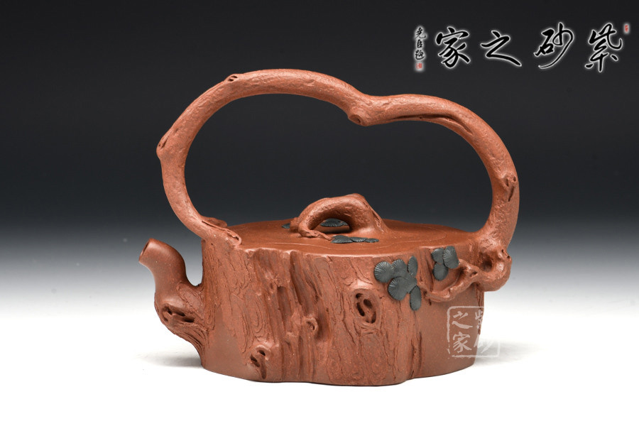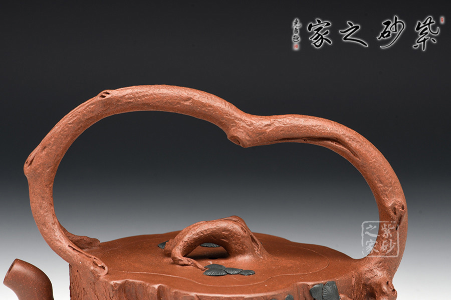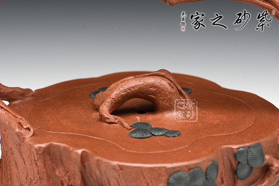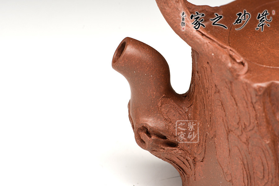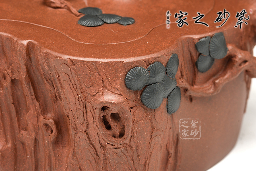 以一截矮樹樁為壺體,挺拔有力。疤節(jié)遍布的樹皮,其上生出新松枝,彰顯出強韌蓬勃的生命力,嘴、把、鈕遒勁多姿,松枝蜿蜒,達(dá)到了精雕細(xì)鏤的效果,整器的色澤沉著而無火氣。