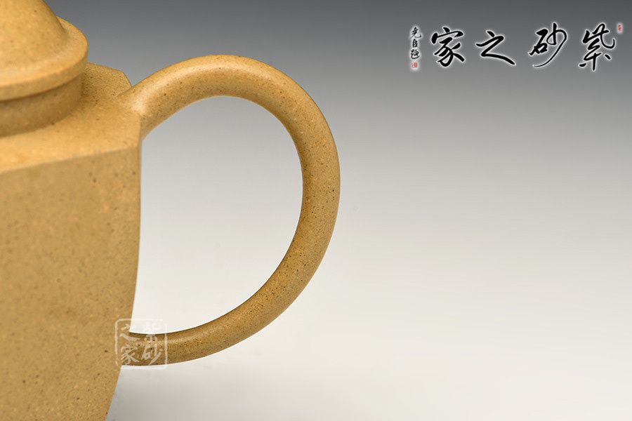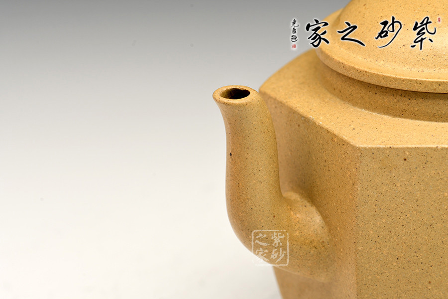 管狀彎流,端口稍平,涓香垂落,玉杯汩汩生福,水流不飛不散;壓蓋與壺身契合,緊扣壺口,氣密性極佳,茗香不散;六方壺鈕與壺身上下呼應,雅致喜人;細彎把自然伸出,棱角分明,力道十足。