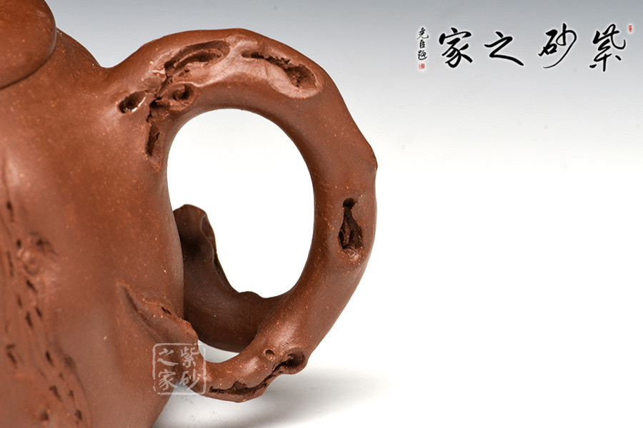 作品壺身以一樹樁為形,枝干蒼勁,穩(wěn)妥古拙,身、流、把遍布癭節(jié),塑造出粗糙的原胎,讓人品味生長中樹木所經(jīng)歷的滄桑歷程,寓意生命的苦難和堅強。