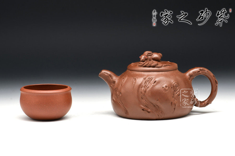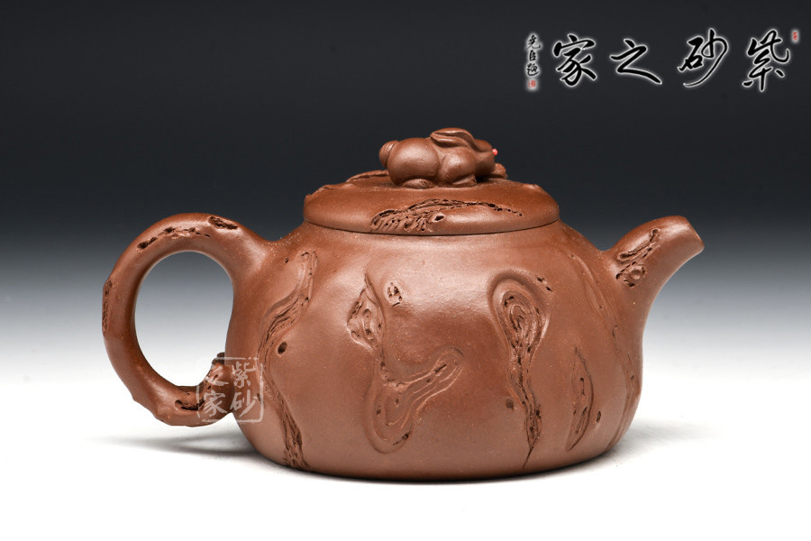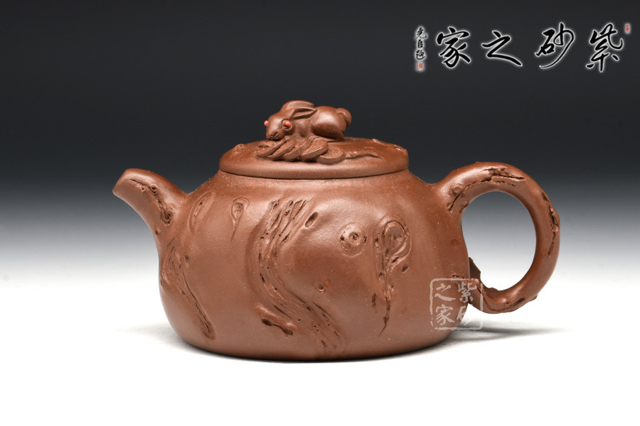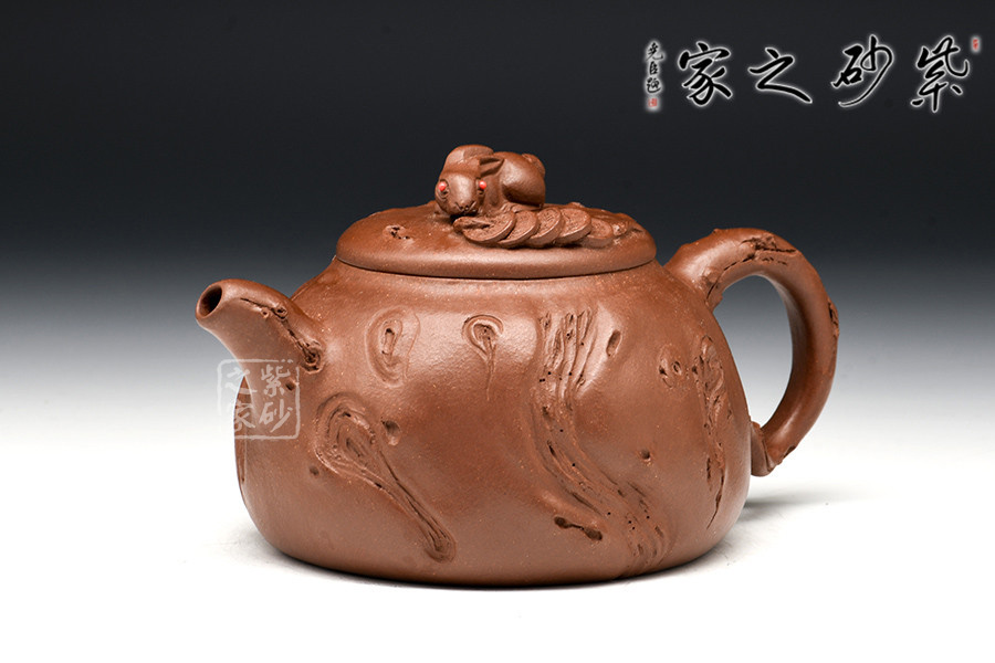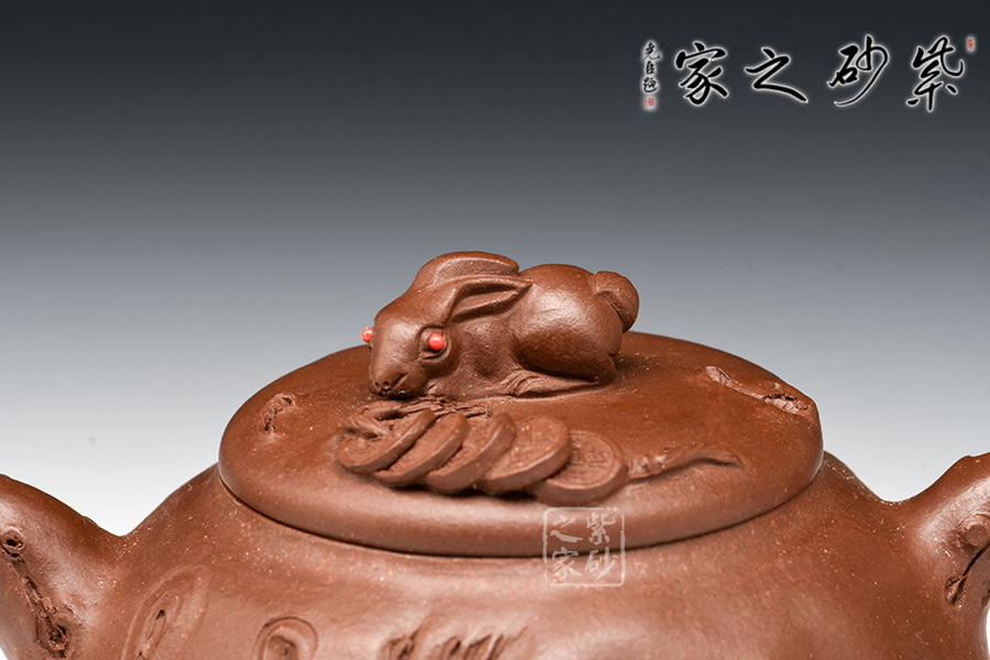 亮點在于此壺以一只趴臥的玉兔為鈕,紅色兔眼“點睛之處”,引人注目;兔子周圍灑滿錢串,寓意財源滾滾,吉祥平安美滿之意盡顯。