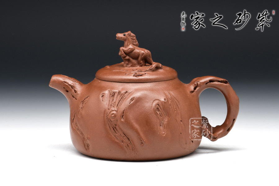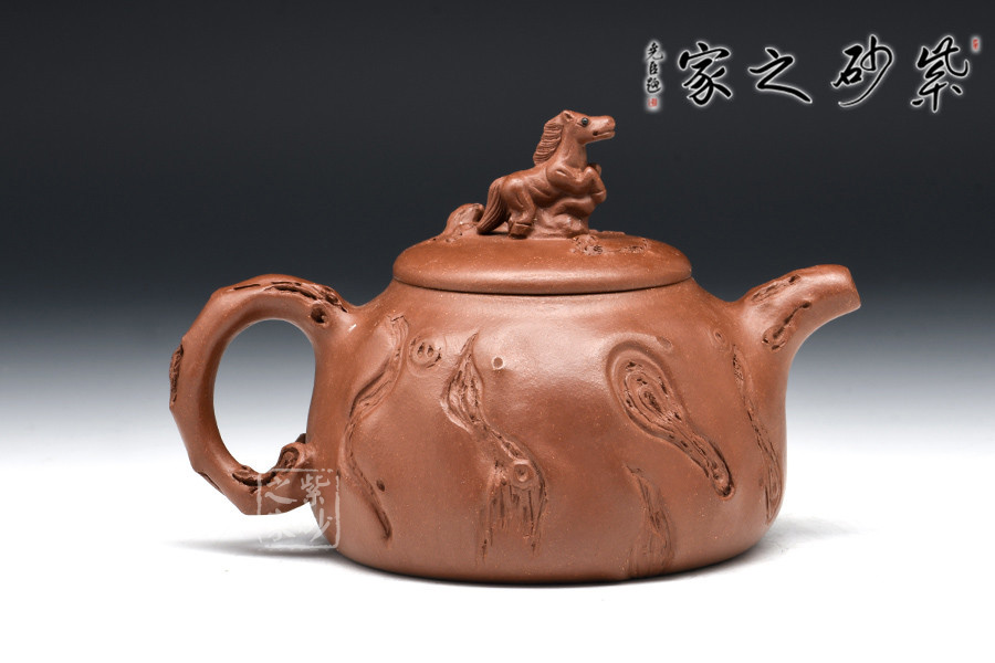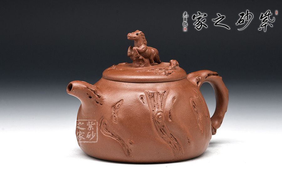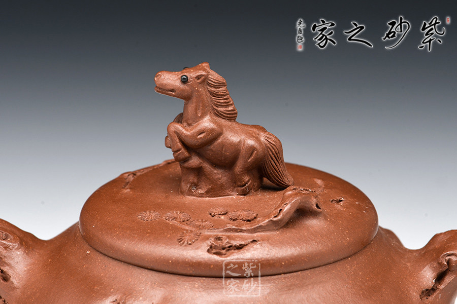 亮點(diǎn)在于此壺以十二生肖之一“馬”作鈕,奔馬飛躍,四蹄翻騰,長鬃飛揚(yáng),壯美的身姿雕塑得栩栩如生,可謂構(gòu)思其巧,自然大氣。