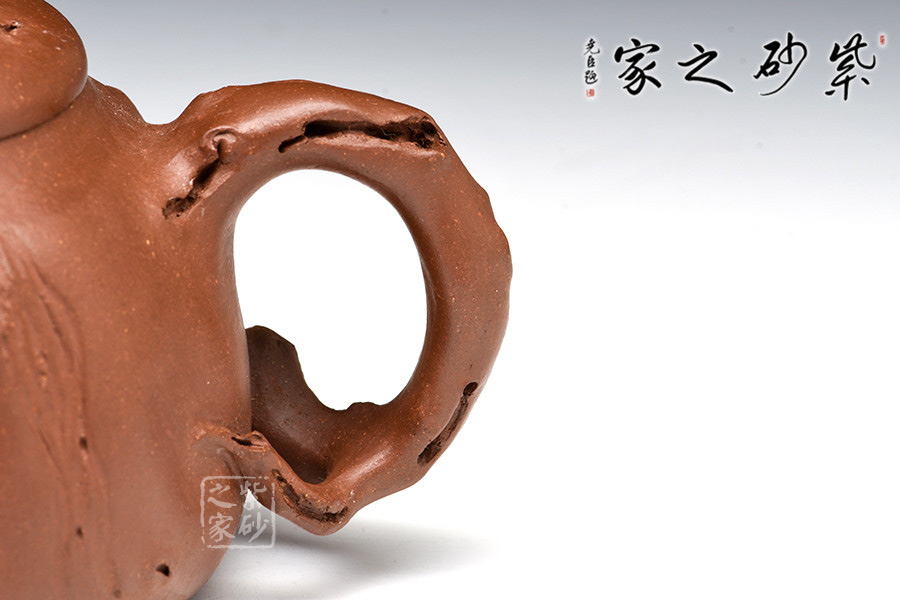 作品壺身以一樹樁為形,枝干蒼勁,穩(wěn)妥古拙,身、流、把遍布癭節(jié),塑造出粗糙的原胎,讓人品味生長中樹木所經(jīng)歷的滄桑歷程,寓意生命的活力和堅(jiān)強(qiáng)。