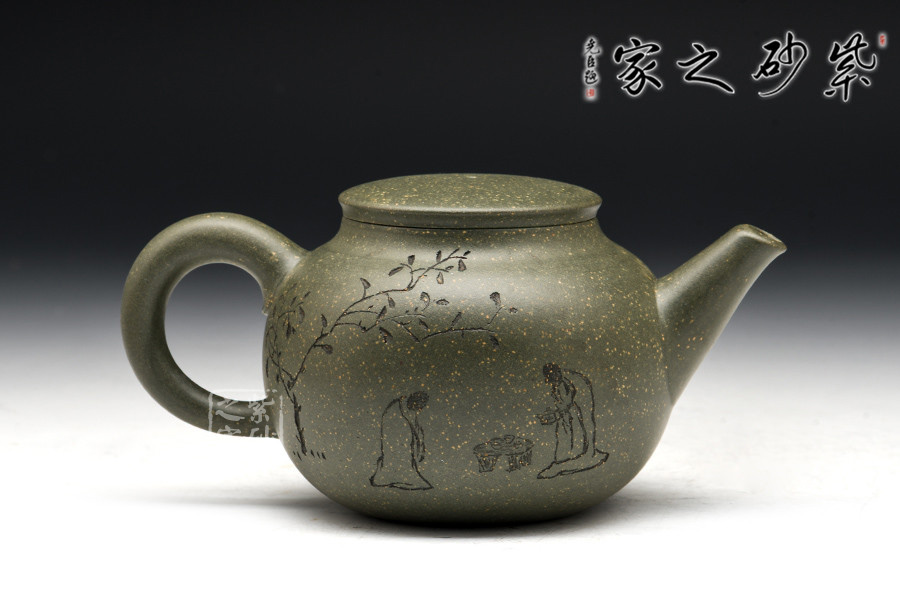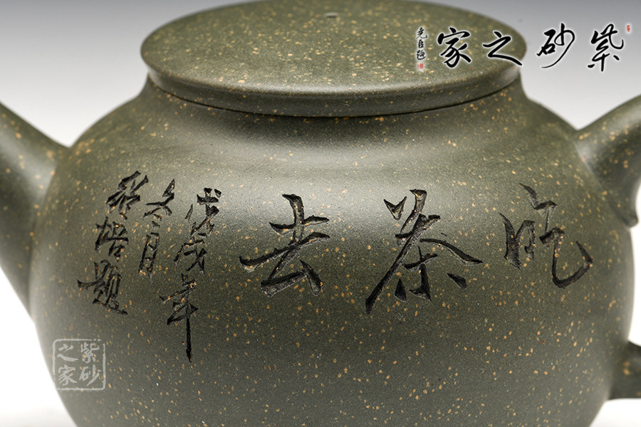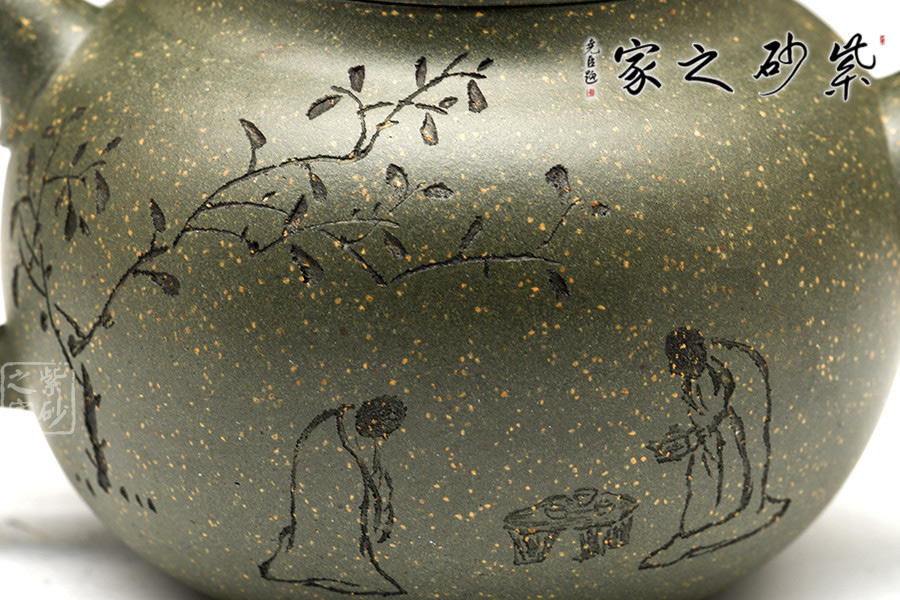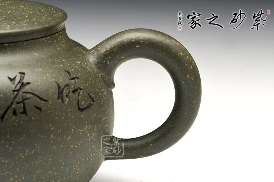 此作通體扁圓,線條柔和,平蓋壓壺,厚實緊密,茗香不散。加上明晰的直嘴、耳形把,與壺身相映襯,更顯別樣的意蘊。