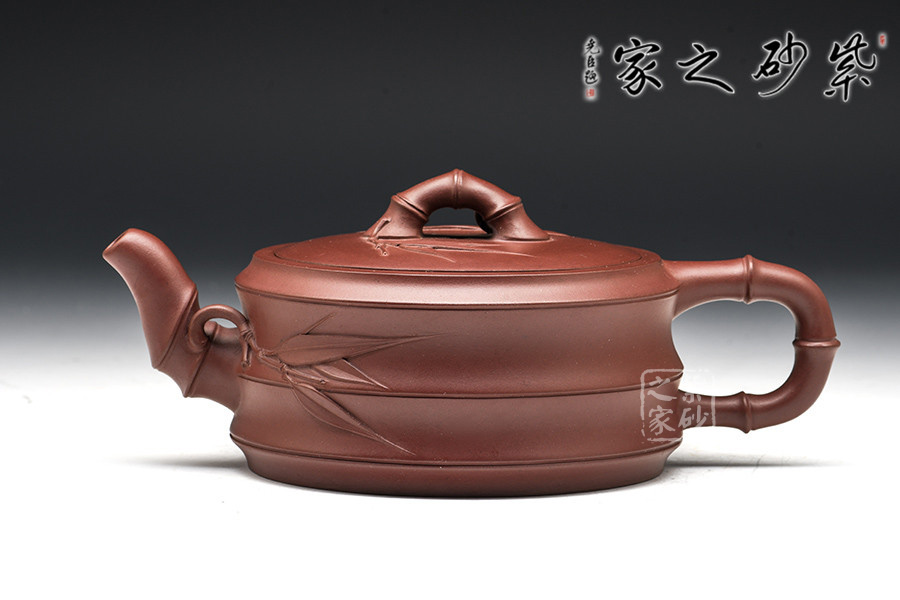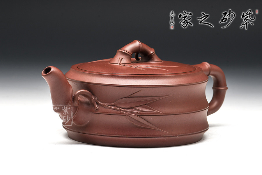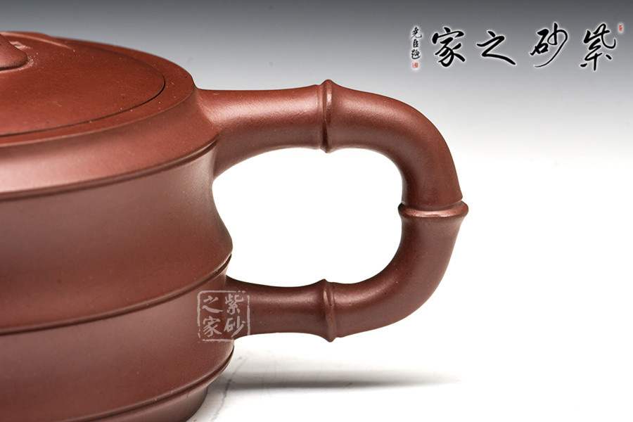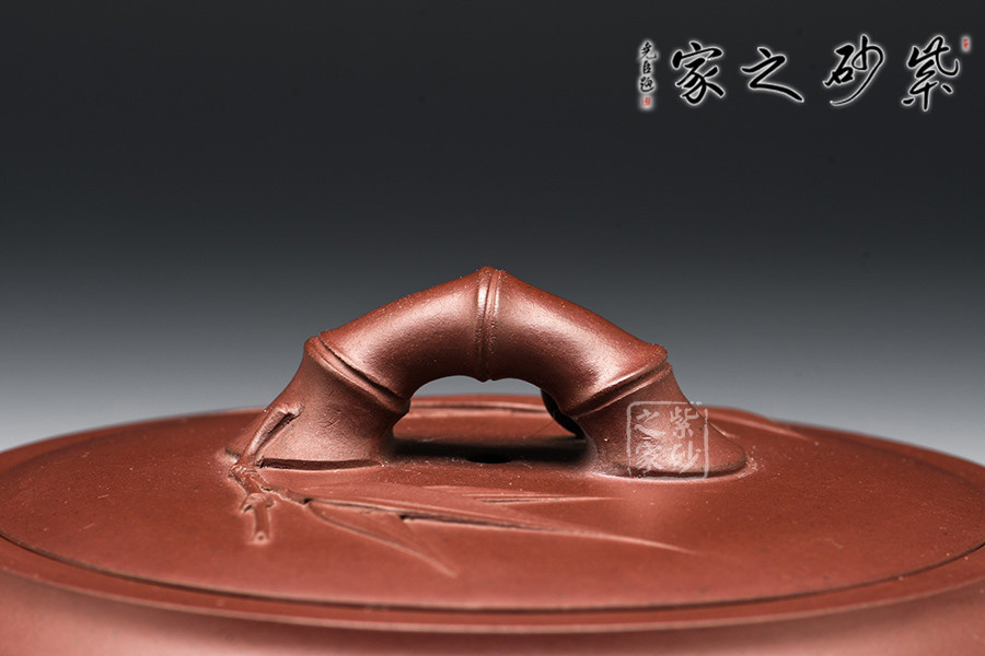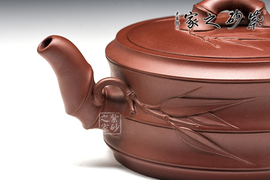 此作以竹為主題的經(jīng)典壺型,壺身采用的是古典造型,筆直而粗壯的壺身,給人一種踏實之感,壺嘴、把、蓋鈕亦取竹段,生動自然,挺拔清秀。有新葉自然長出,顯示勃勃生機,清韻洗練。