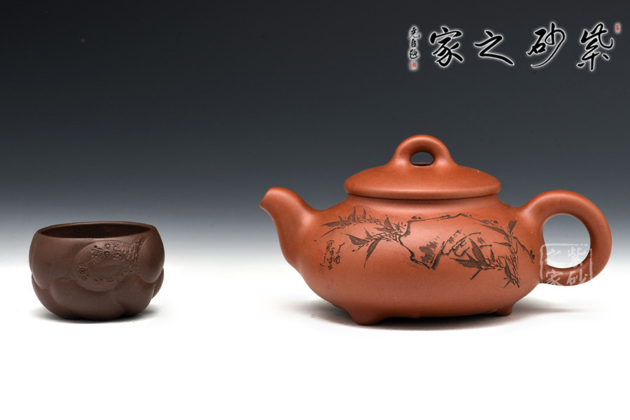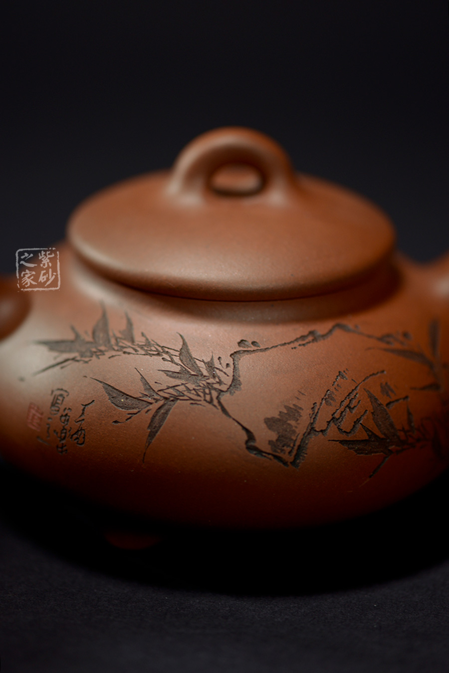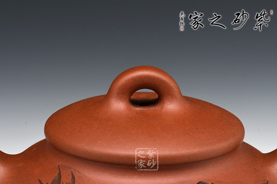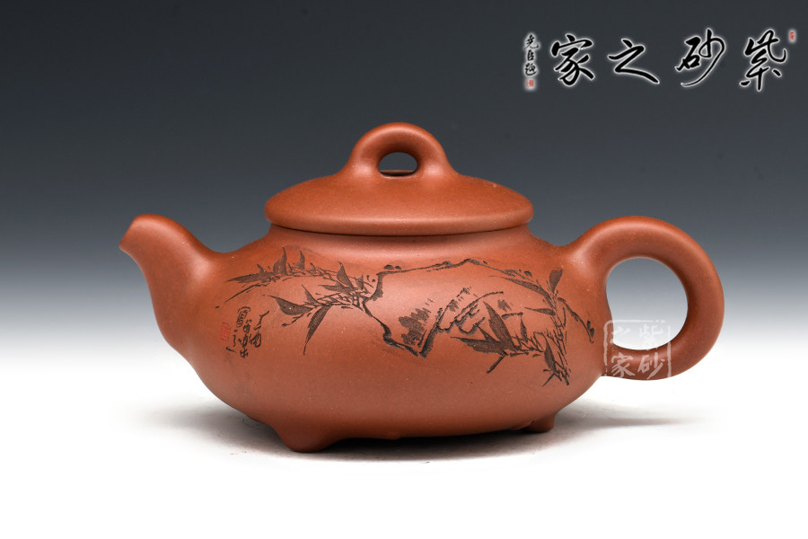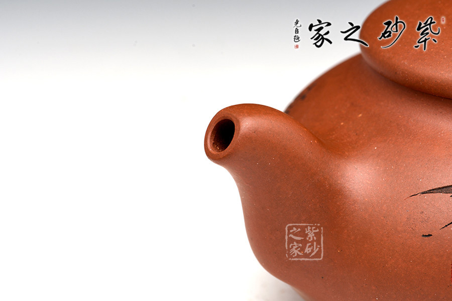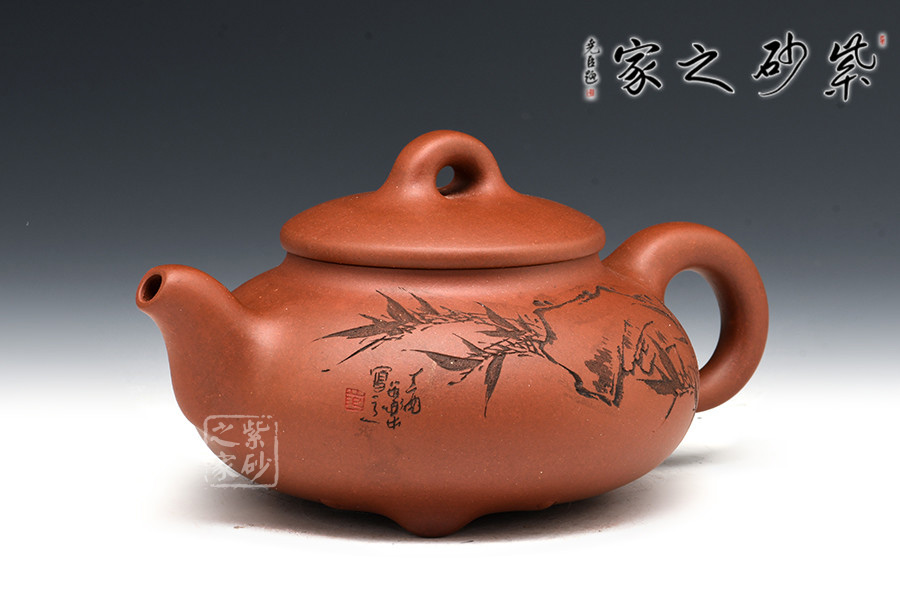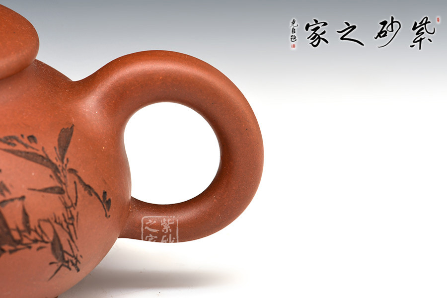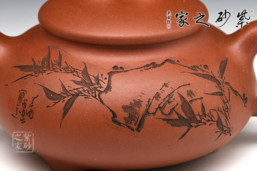A面: 裝飾: 描黑竹子 裝飾者:范小君(缶樂) 裝飾內(nèi)容: 這款壺的壺身裝飾由陶刻名家范小君(缶樂)操刀,壺身正面刻繪的是翠竹,生于亂石腳下,不依不靠,枝節(jié)蒼勁挺括,竹葉清靈飄逸,葉片片不同,節(jié)處處纖瘦,略微描黑的感覺停留在描與不描之間,恰似國畫中清淡的山水潑墨,不像濃墨重彩一般的附庸風(fēng)雅,顯得極為自然傳神。