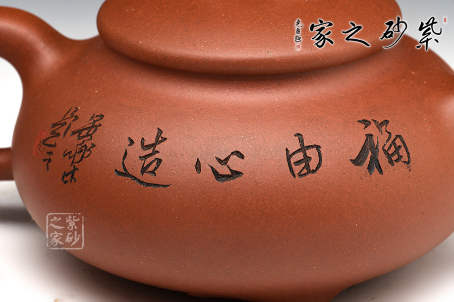 B面: 裝飾: 描黑詩詞 裝飾者:范小君(缶樂) 裝飾內(nèi)容: 這款壺的壺身裝飾由陶刻名家范小君(缶樂)操刀,壺身反面刻繪的是“福由心造”四個字,出自清·李綠園《歧路燈》第九十九回:“紹聞忽然想起,此廳當(dāng)日俱是猥褻之語,與今日相較,天淵相懸,云泥迥隔,可見地因人靈,福由心造?!币鉃樾牡睾?,能行善,就能得到幸福。