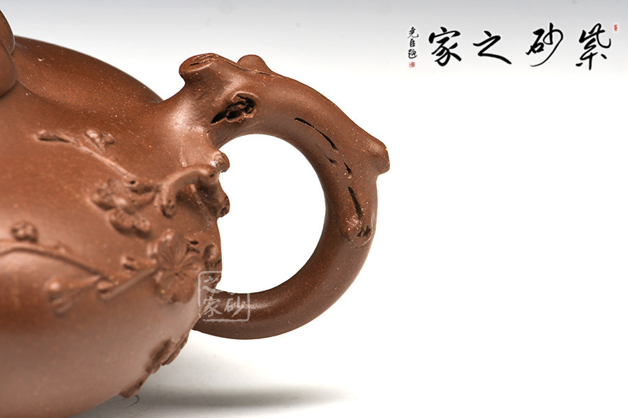 流嘴、執(zhí)把、壺鈕皆以蒼勁的梅桿塑成,壺身與壺蓋以曲繞遒勁的梅瓣梅枝點(diǎn)綴。生動(dòng)逼真的梅花梅朵從枝干上冒出,攀沿至壺身,錯(cuò)落有致,梅花或盛開或待放,姿態(tài)優(yōu)美動(dòng)人。