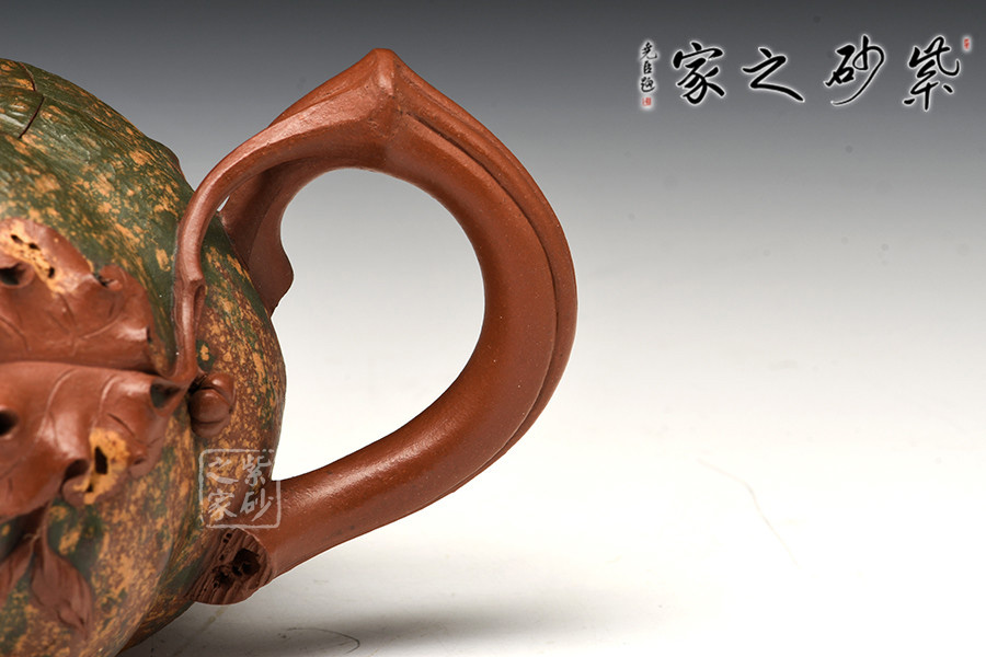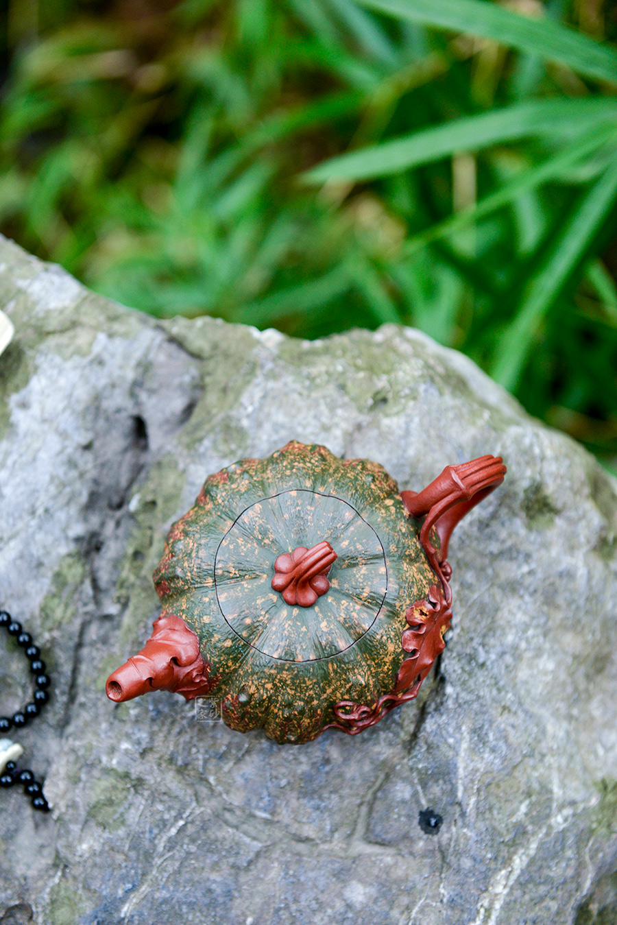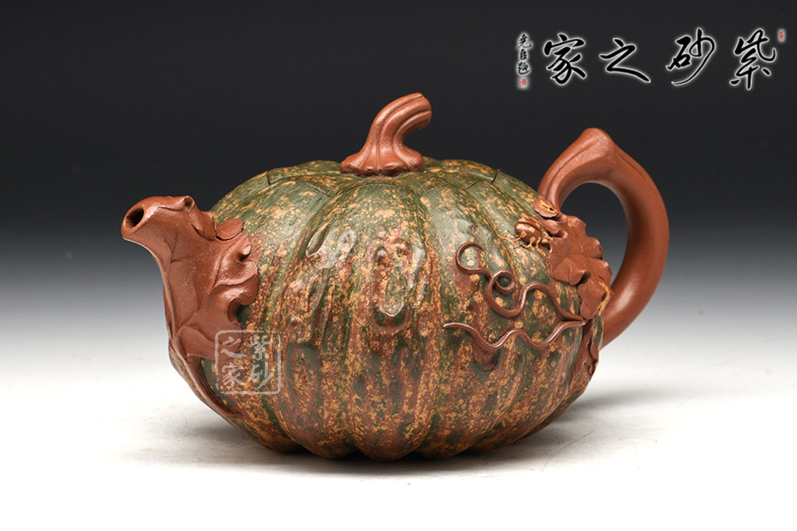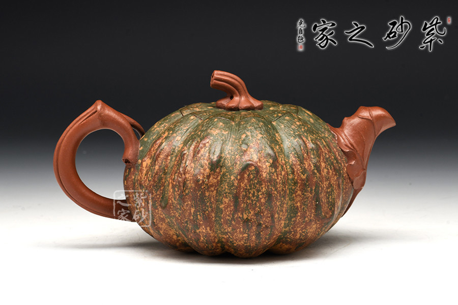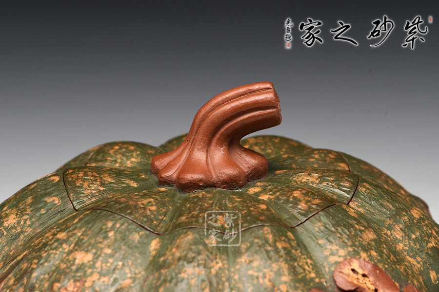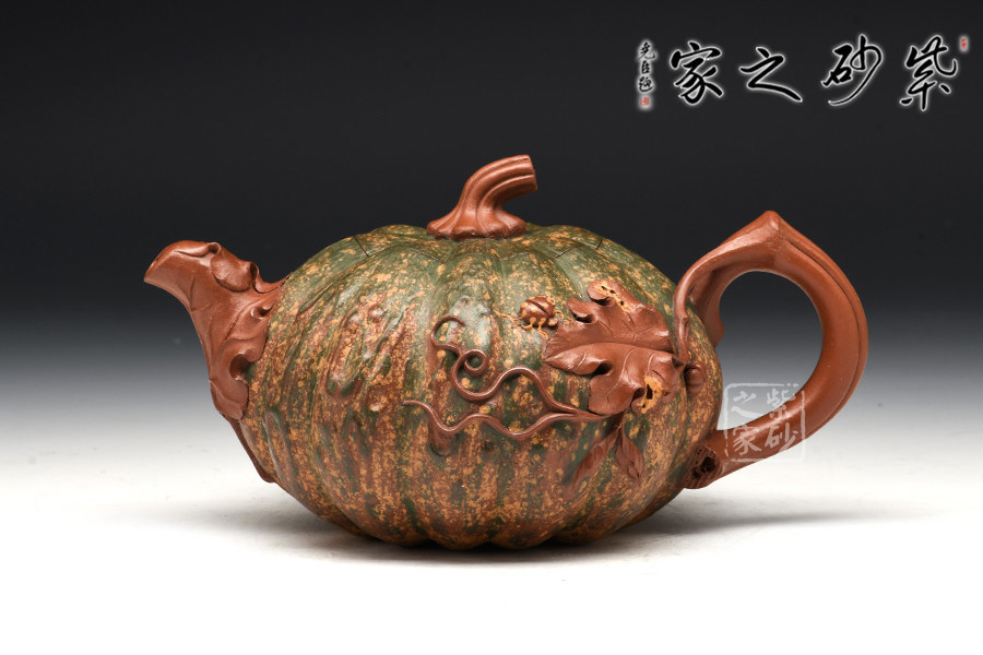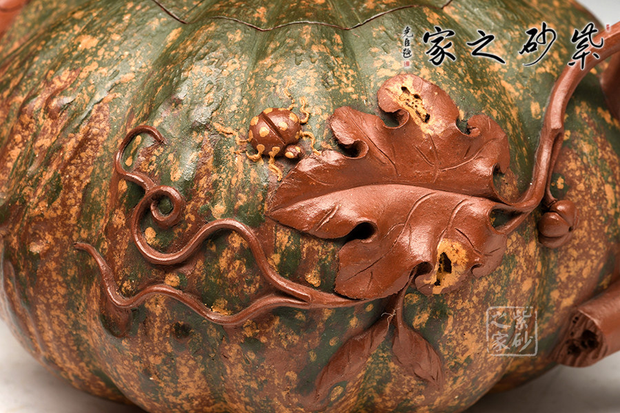 此作有別于一般南瓜壺的亮點(diǎn)在于不僅外形酷似南瓜,更是采用雙色泥的裝飾工藝方法,集聚了南瓜的神韻,猶若瓜熟即將待落,精巧別致,創(chuàng)意極新。