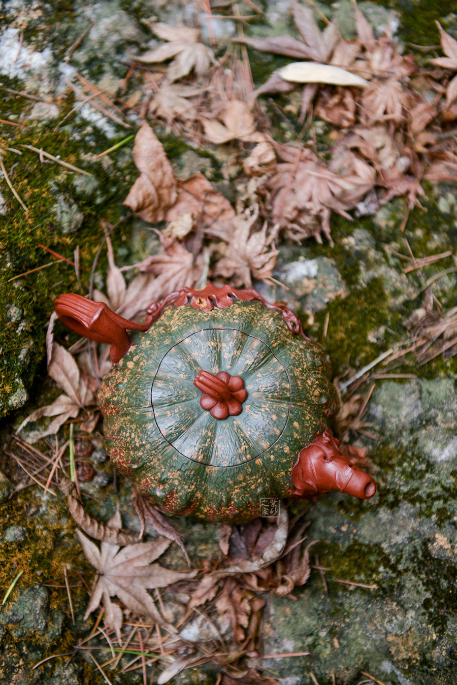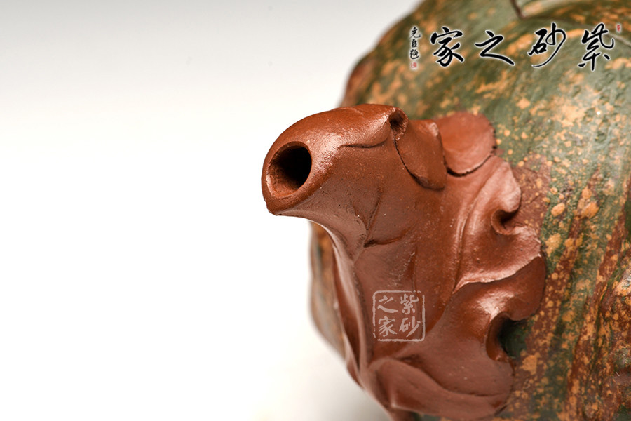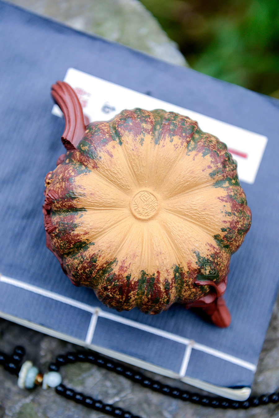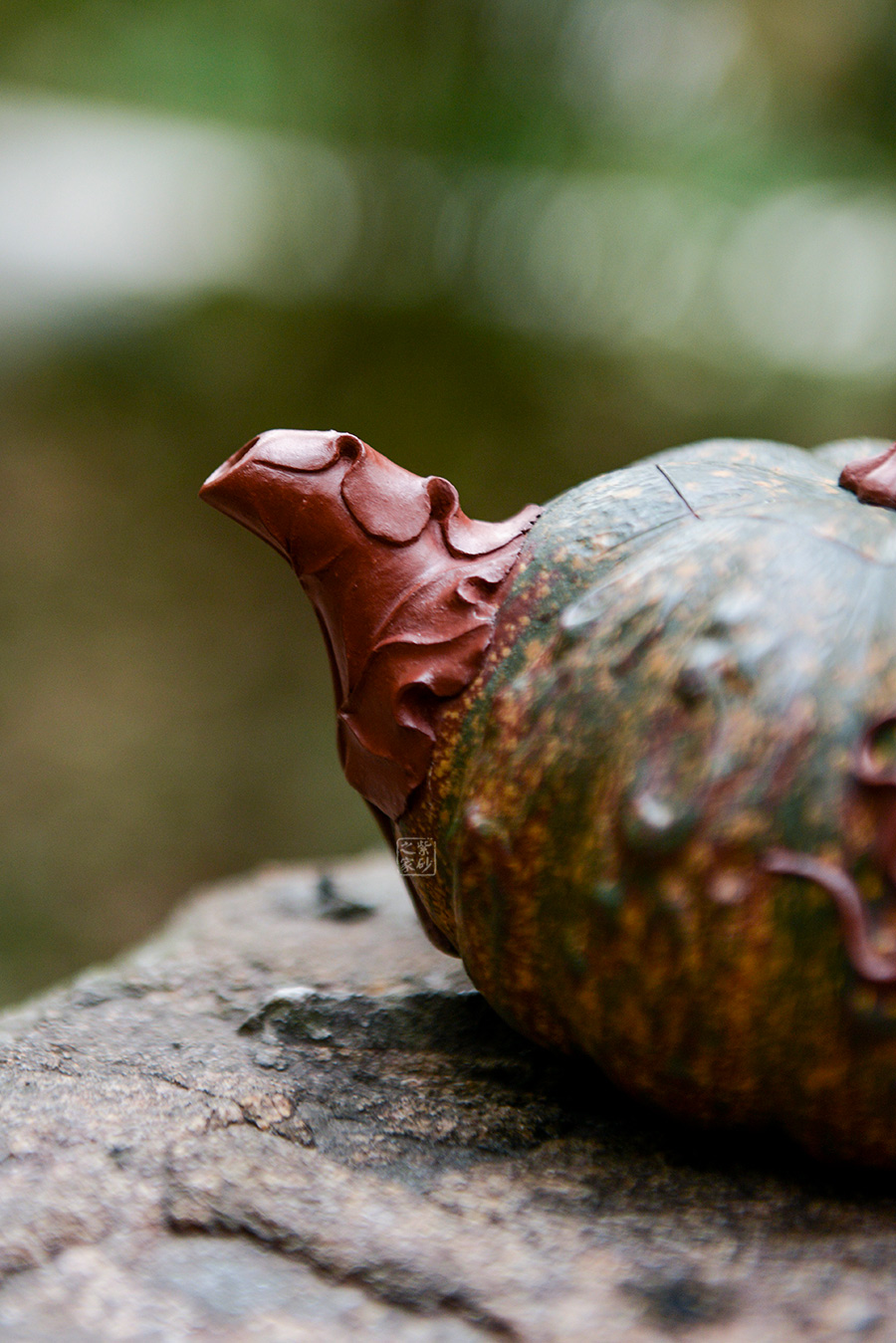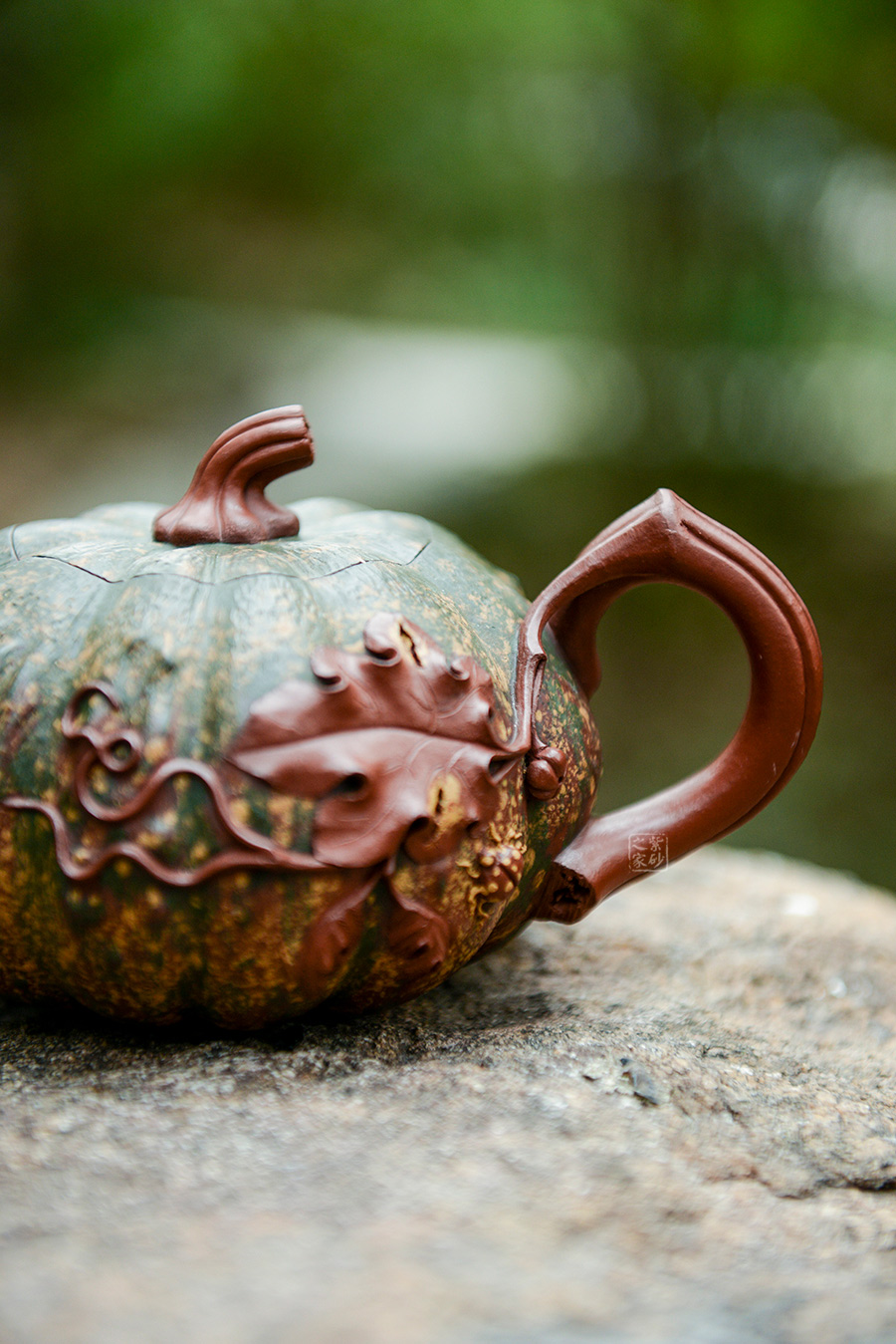 此作有別于一般南瓜壺的亮點(diǎn)在于不僅外形酷似南瓜,更是采用雙色泥的裝飾工藝方法,集聚了南瓜的神韻,猶若瓜熟即將待落,精巧別致,創(chuàng)意極新。