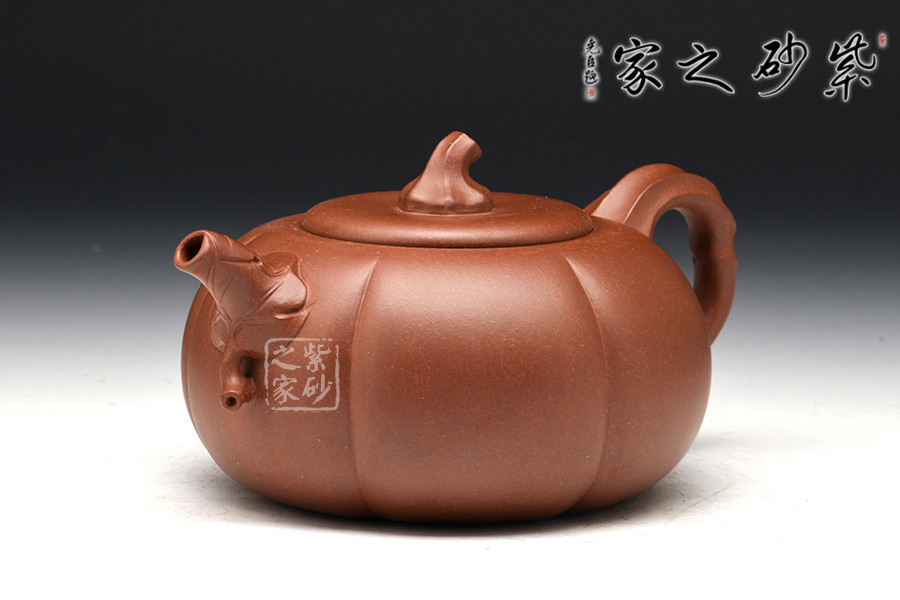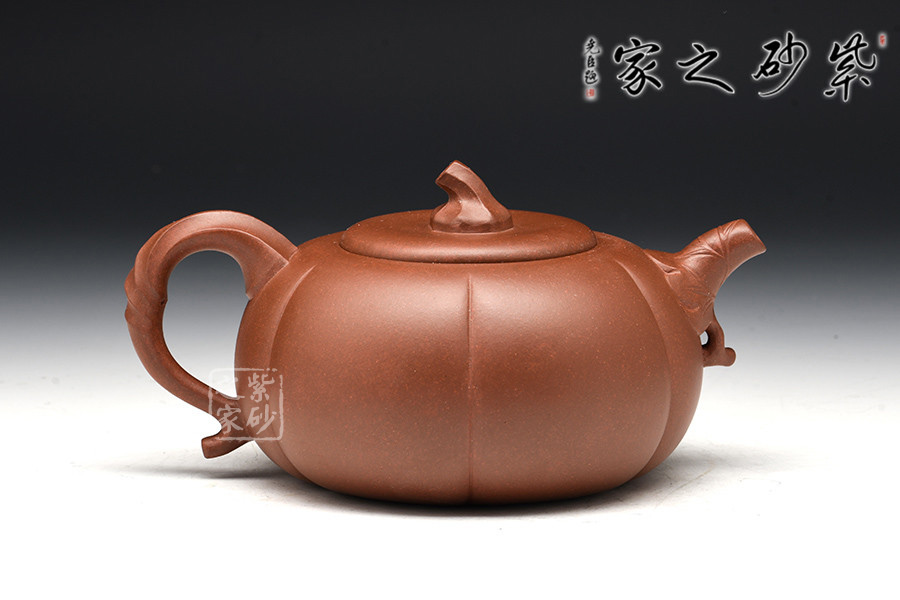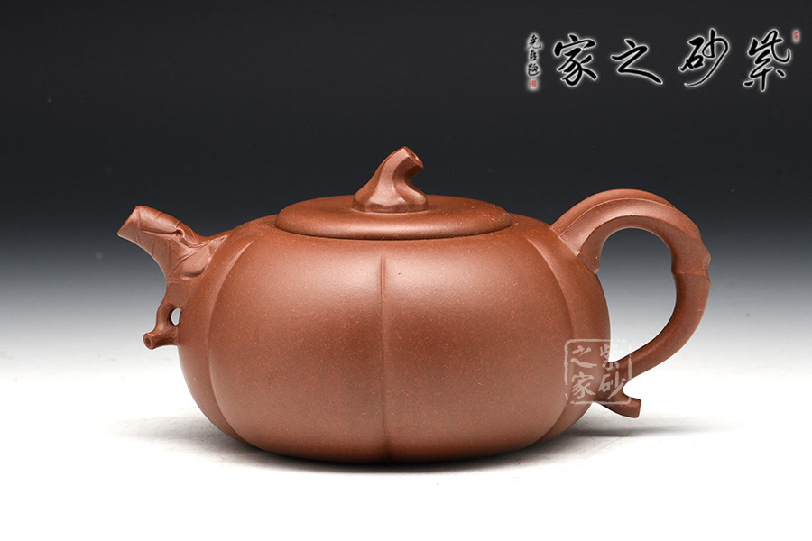 壺以扁圓南瓜體為身,瓜蒂為鈕,藤為流把。瓜棱勻稱飽滿,蓋與身上下貫通,弧線優(yōu)美,和諧自然。