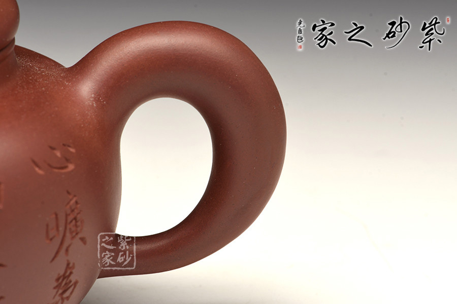 此作型制似乳鼎,端莊渾樸,雄厚神韻。壺身形體飽滿,線條挺括流暢,壺鈕似乳,蓋于壺身之上,含蓄而內(nèi)斂。珍貴稀有泥料玫瑰紅泥,市面罕見,成品率低,成品壺色澤溫潤(rùn)、細(xì)膩、紅艷。壺嘴、壺把圓潤(rùn),與壺身搭配協(xié)調(diào)、比例勻稱,此壺穩(wěn)重而不失輕靈。