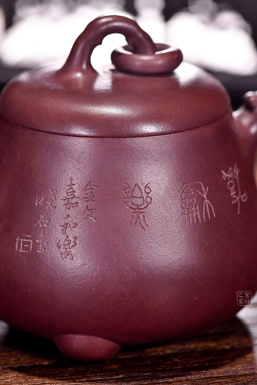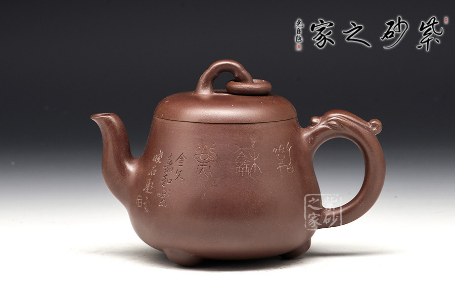 圓筒形的壺體,上斂下闊,適茶性好,沖泡方便。把手處裝飾龍首,橋型壺鈕扣有一活動圈環(huán)。此壺還有一獨(dú)特之處在于其底部的三足,于沈穩(wěn)的壺型中加以縱向的空間感,更為古雅穩(wěn)重。