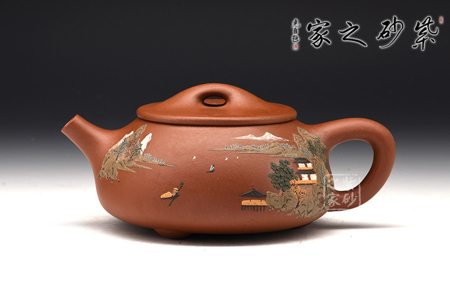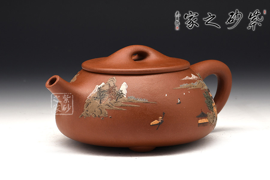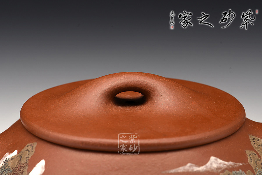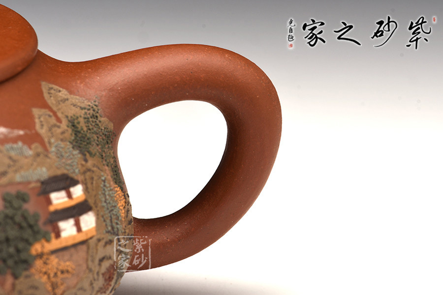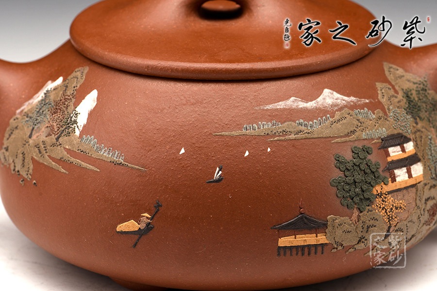 壺體周身細(xì)繪山水圖,通過不同的筆墨、色彩、方法來展現(xiàn)山水,筆法細(xì)膩,惟妙惟肖,山水布局精妙,泥繪用色濃淡相宜,師法自然如得地之造化,讓人如臨詩詞古人之境。