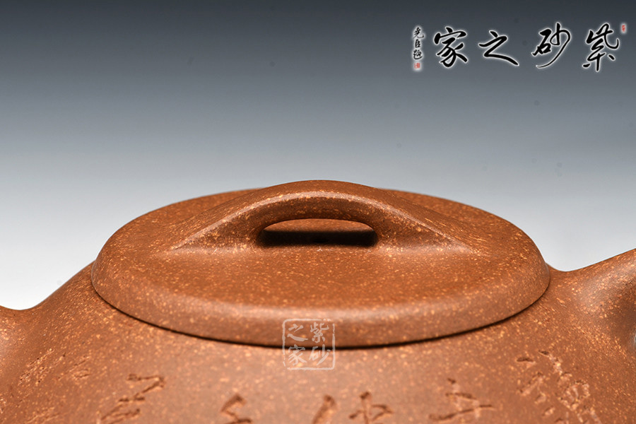 作品壺身呈三角造型,壺嘴延壺腹弧度斜向上伸,把則順壺肩平伸向上弓起,前后相應(yīng)妙趣橫生,壺身處處銜接自然流暢,線條利落明確,起承轉(zhuǎn)合交待清楚,舒展挺拔。