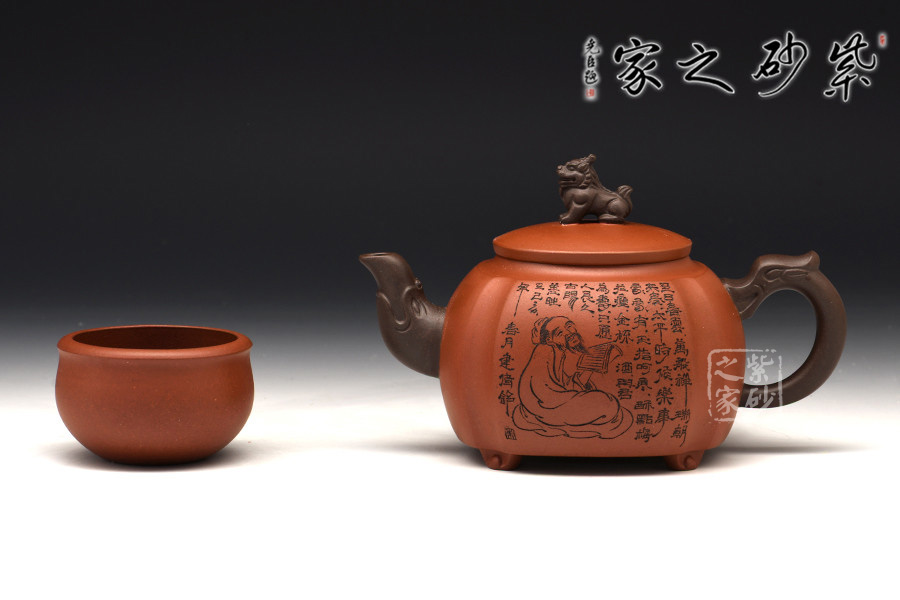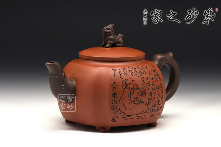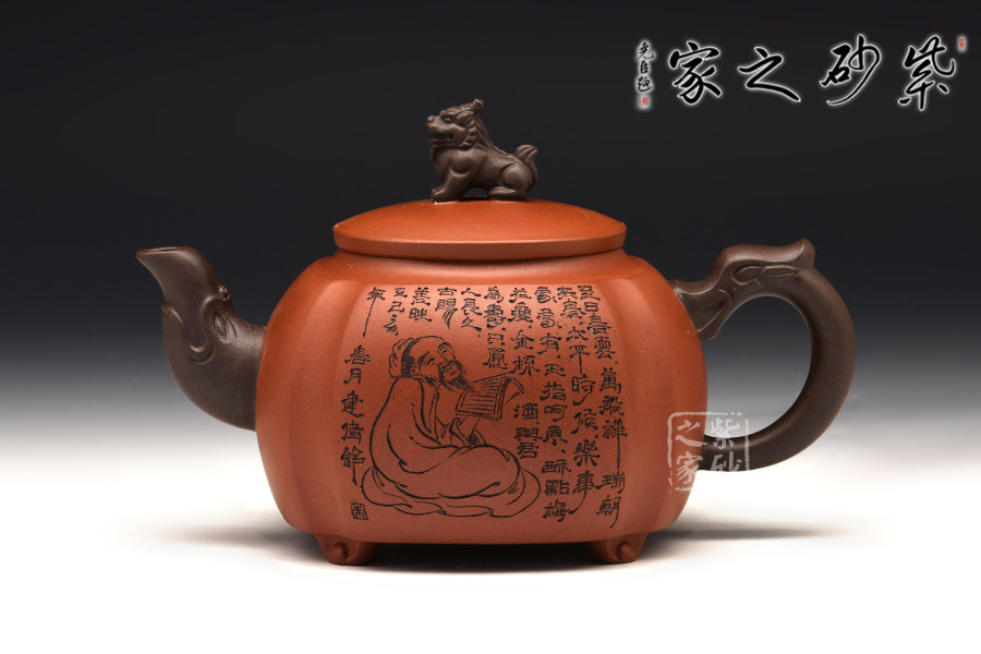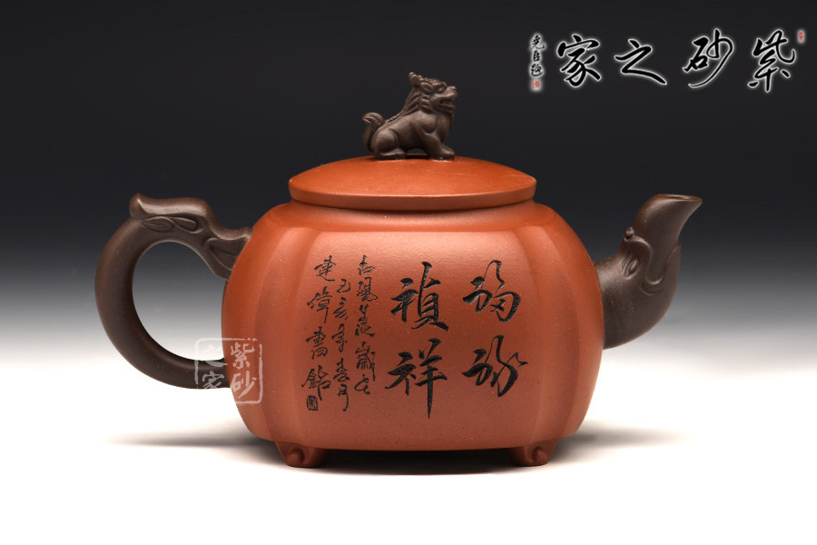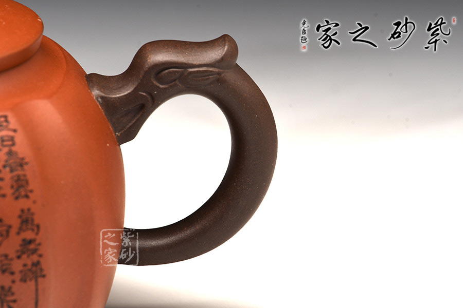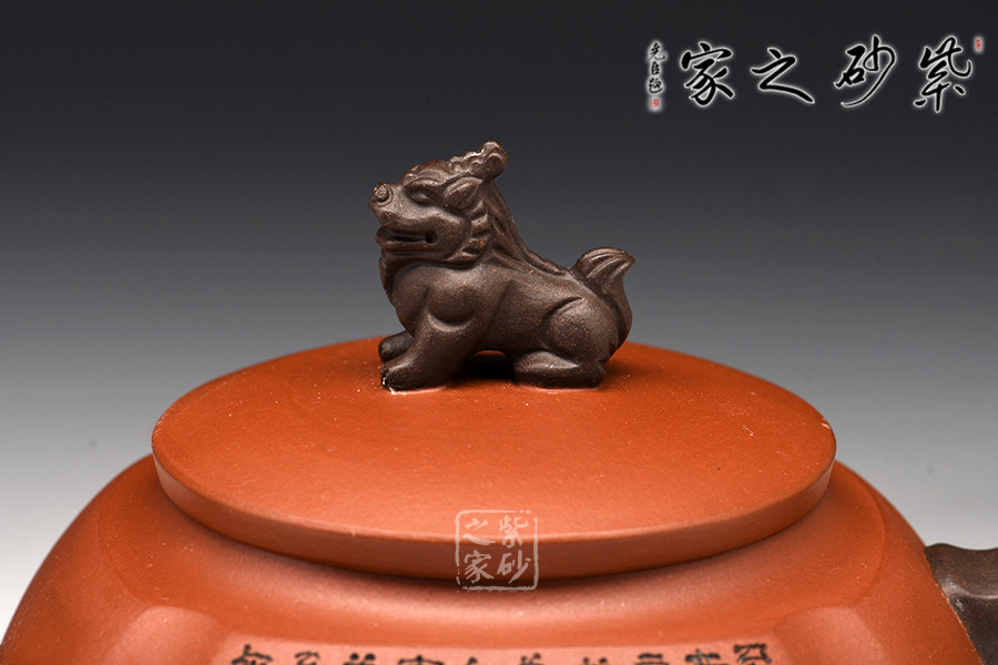 此壺挺拔工整,又透出圓潤的溫婉,造型別致。獅子形壺鈕,壺嘴和把皆以龍形為元素,刻畫生動形象,精雕細刻,展霸氣風范。