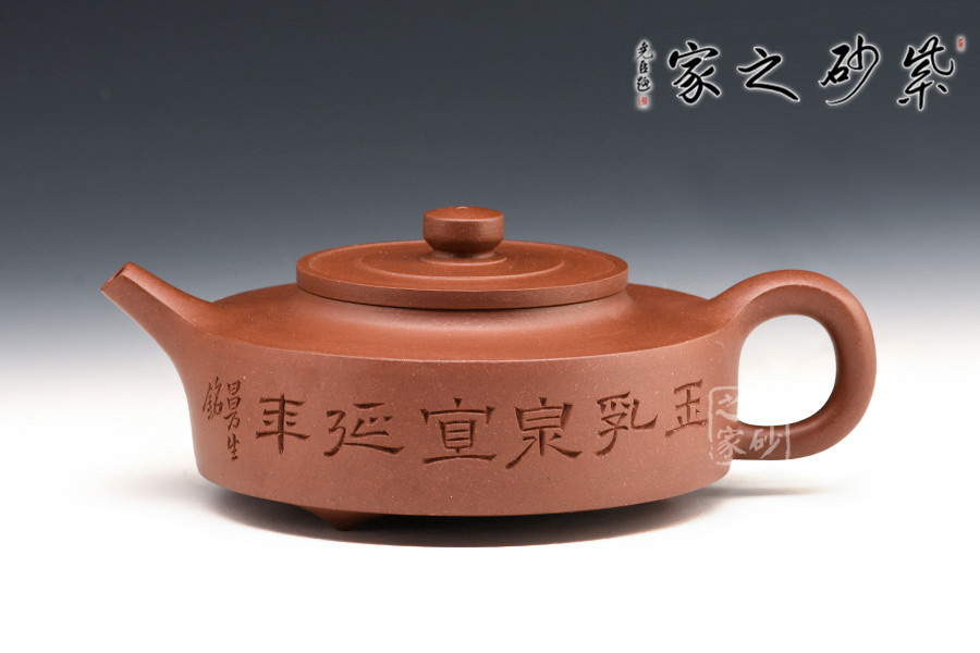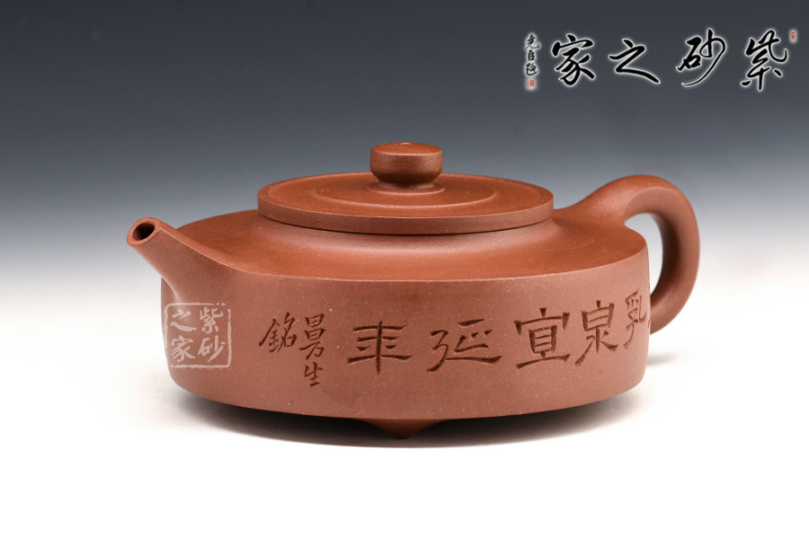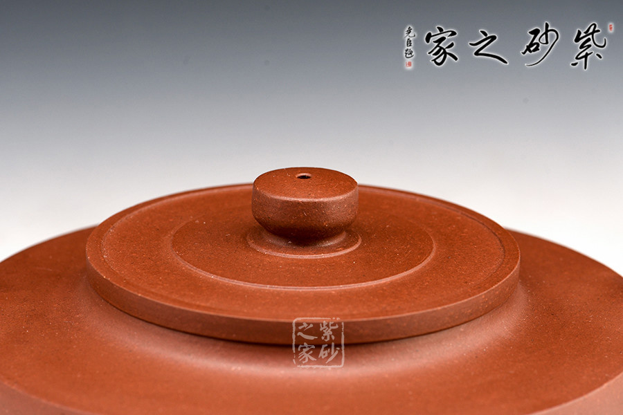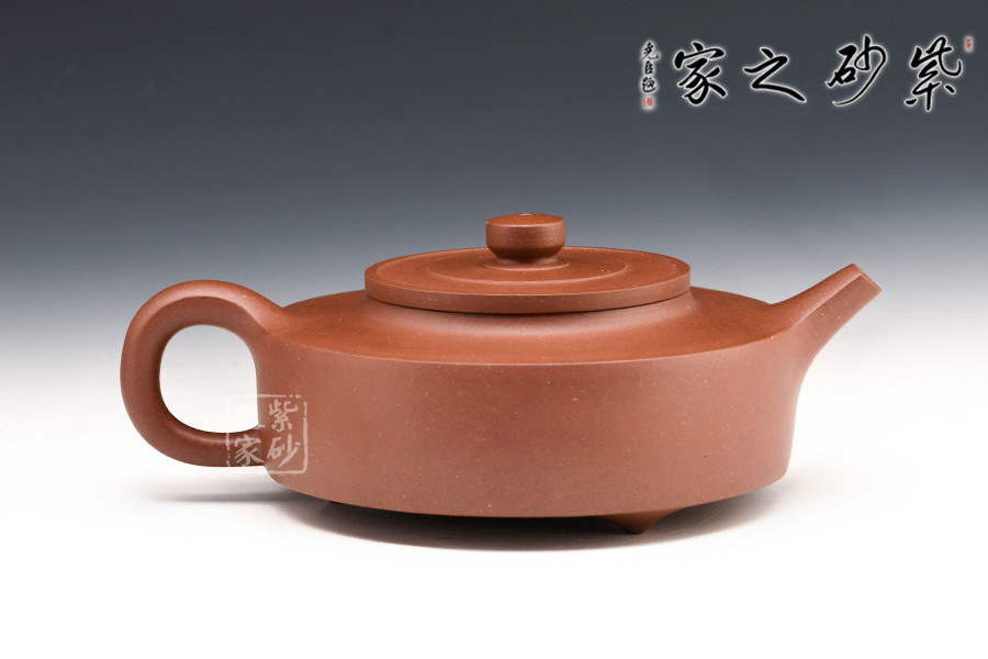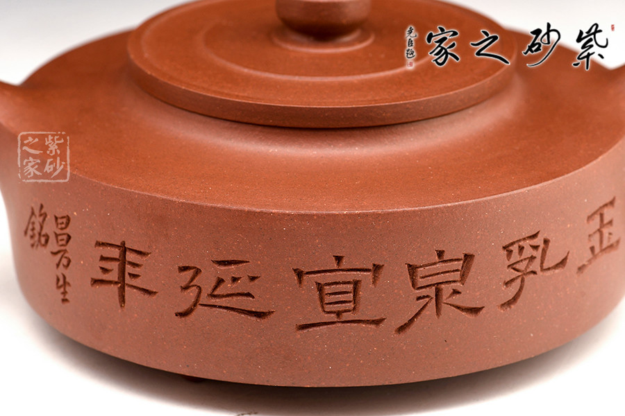 周盤壺為曼生壺式之一,又稱乳鼎壺。壺身造型為扁圓,坡頸平口。此壺流短直、把圓環(huán)略方,鈕圓柱狀,壺底為圓環(huán),并有三枚乳丁分布于壺底。