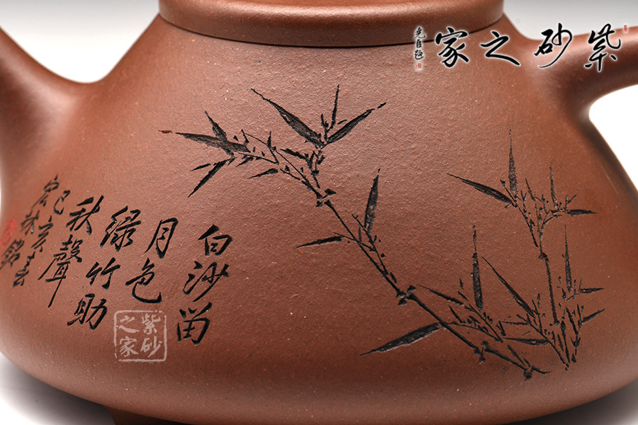 作品壺身呈三角造型,線條利落明確,起承轉(zhuǎn)合交待清楚,舒展挺拔。三圓足支起全身,使整器顯得挺括有神,可見老師制壺功力。