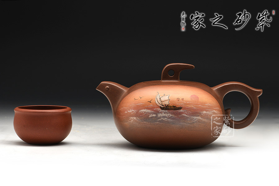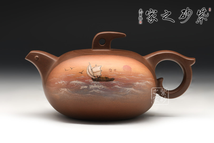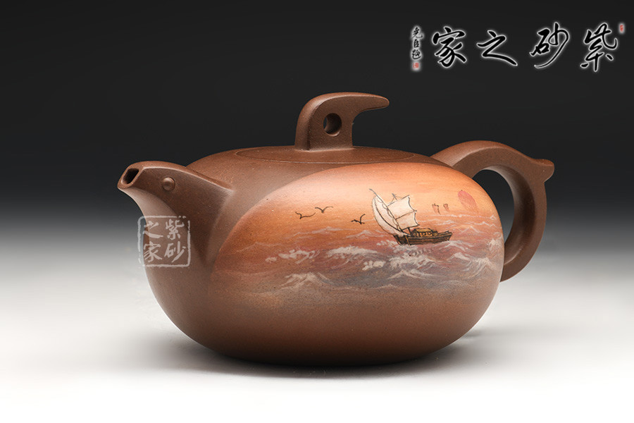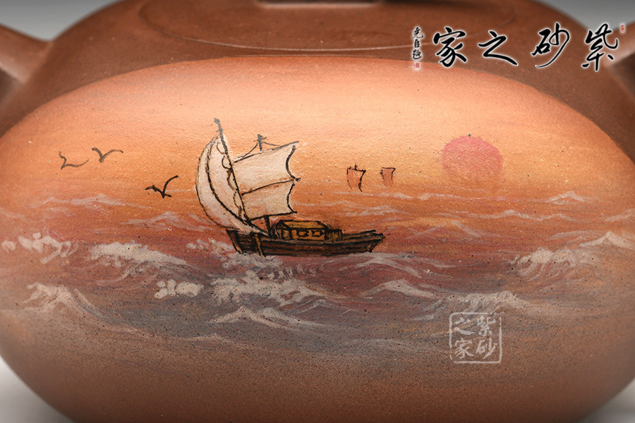 此壺的扁圓壺身造型飽滿溫和,壺身上下平和,整體略扁,嵌蓋與壺口嚴(yán)絲合縫,氣密性極佳,且蓋面平整,如平靜的水面一樣沒有漣漪。壺鈕尤為別致,為撐起的帆,高聳于水面之上;壺嘴、飛把支撐帆船,借著徐徐的清風(fēng),向前駛?cè)?,這正是“一帆風(fēng)順”的寓意所在。