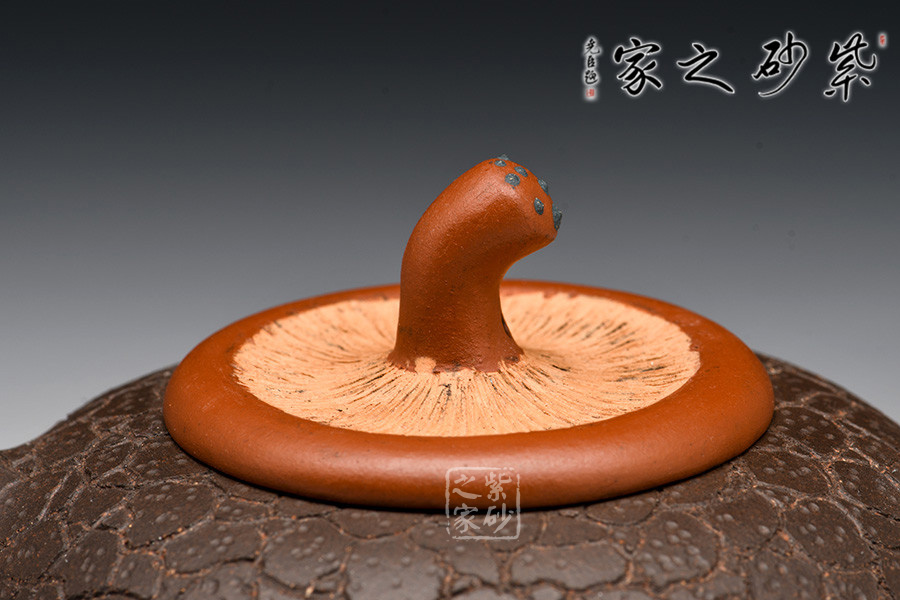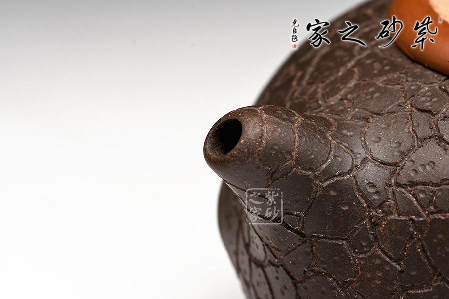 此作不同于其他一般供春壺的亮點在于老師在壺蓋鈕上運用了雙色泥的制作工藝,觀之引人注目,又不失精貴雅致。