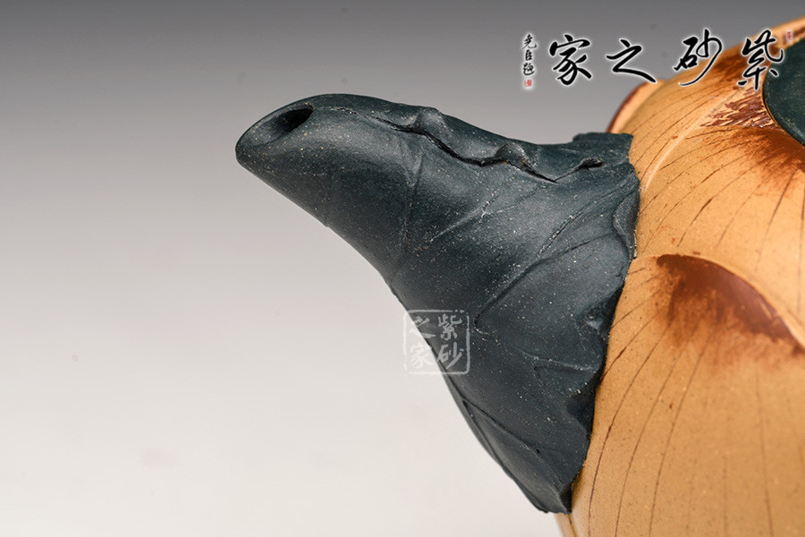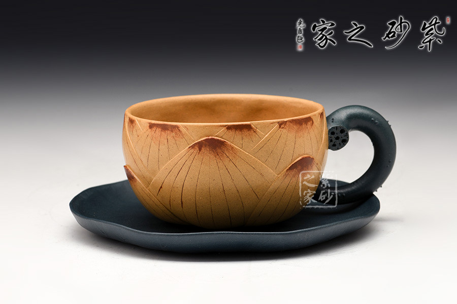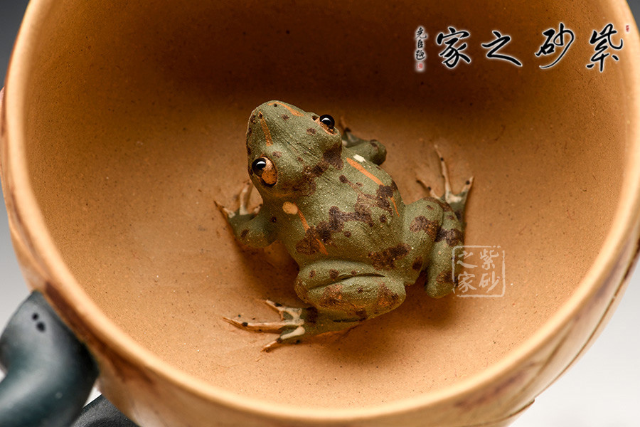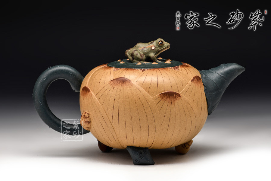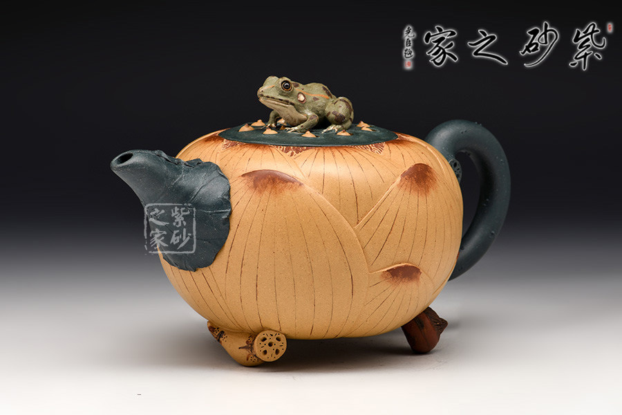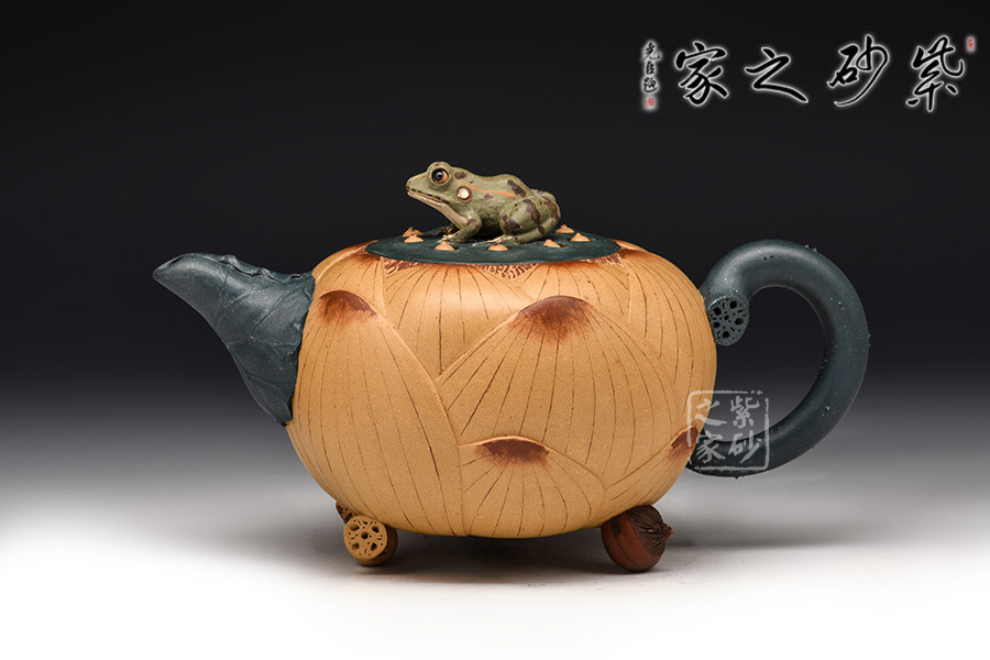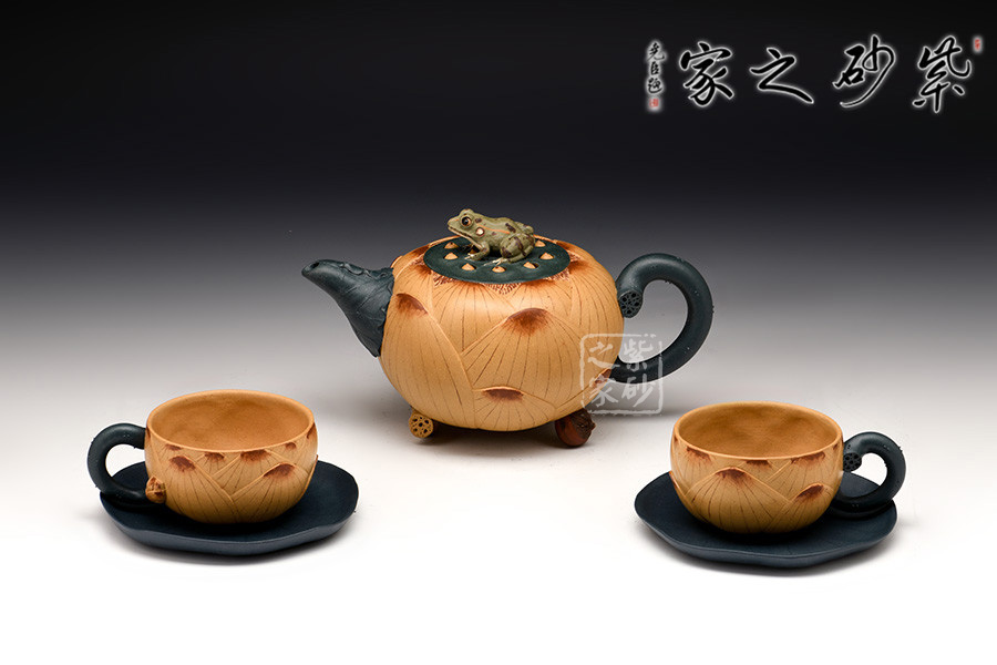 此套茶具以一壺二杯二碟組成,以瑩潤的蓮花作為整體造型,壺鈕塑造為一只栩栩如生的青蛙,蓮花合成壺身,荷葉為流、根藕為把。壺底三足,以菱角和蓮藕制作,用心巧妙,讓人由衷贊嘆。