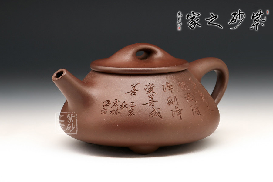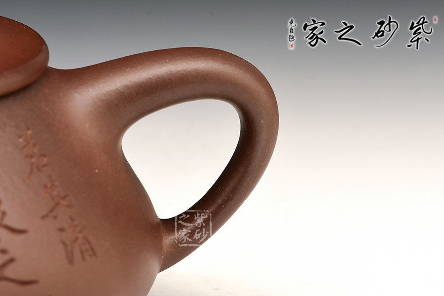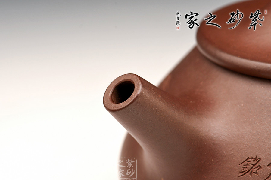 本件石瓢壺從壺式上看,壺形上小下大,重心下垂,造型沉穩(wěn),壺嘴為矮而有力的直筒形,出水暢順,極速有力。壺身呈“金字塔”式,壺流、壺口、壺把三點,符合科學(xué)性,觀賞端莊敦穆。