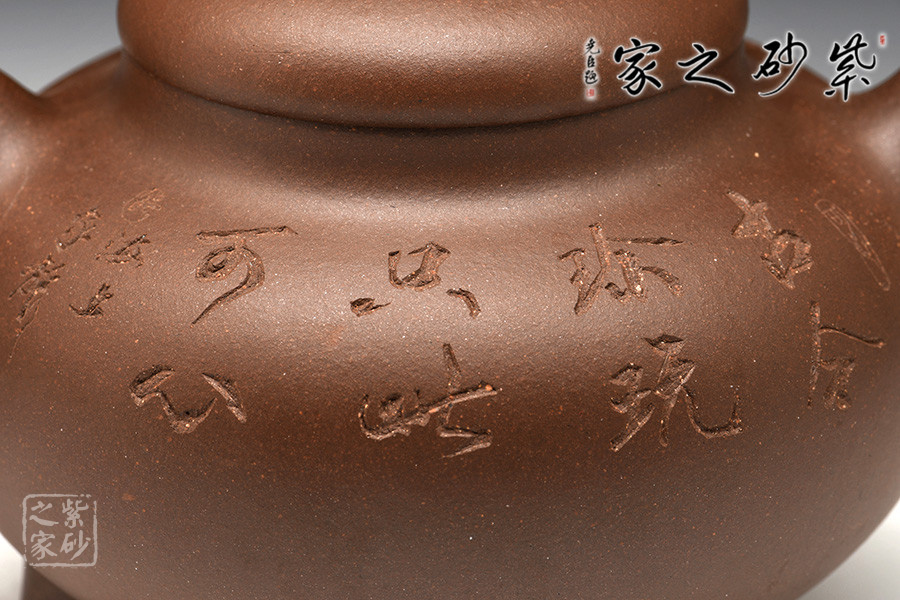 光貨離不開裝飾。俗話說“壺隨字貴,字隨壺傳”:光壺不刻字,就是一把光壺;壺上面刻了大師、名人的字,一把壺的含金量就高了,收藏價值就更高,升值潛力就更大。王福君與中國工藝美術(shù)大師譚泉海合作最多,其次是徐安碧、鮑志強、毛國強(均為中國工藝美術(shù)大師、中國陶瓷藝術(shù)大師)。