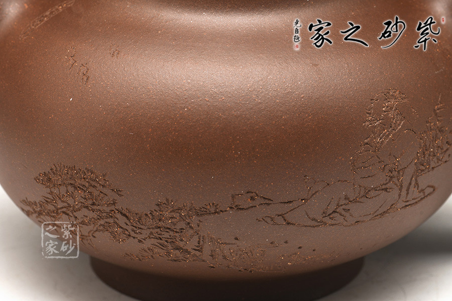 光貨離不開裝飾。俗話說(shuō)“壺隨字貴,字隨壺傳”:光壺不刻字,就是一把光壺;壺上面刻了大師、名人的字,一把壺的含金量就高了,收藏價(jià)值就更高,升值潛力就更大。王福君與中國(guó)工藝美術(shù)大師譚泉海合作最多,其次是徐安碧、鮑志強(qiáng)、毛國(guó)強(qiáng)(均為中國(guó)工藝美術(shù)大師、中國(guó)陶瓷藝術(shù)大師)。