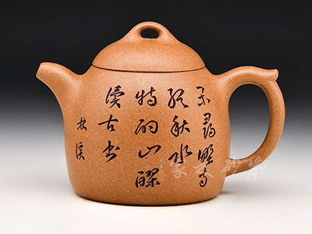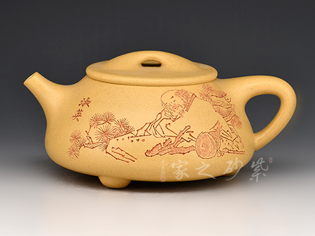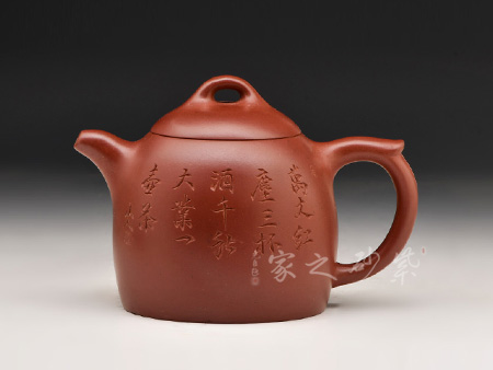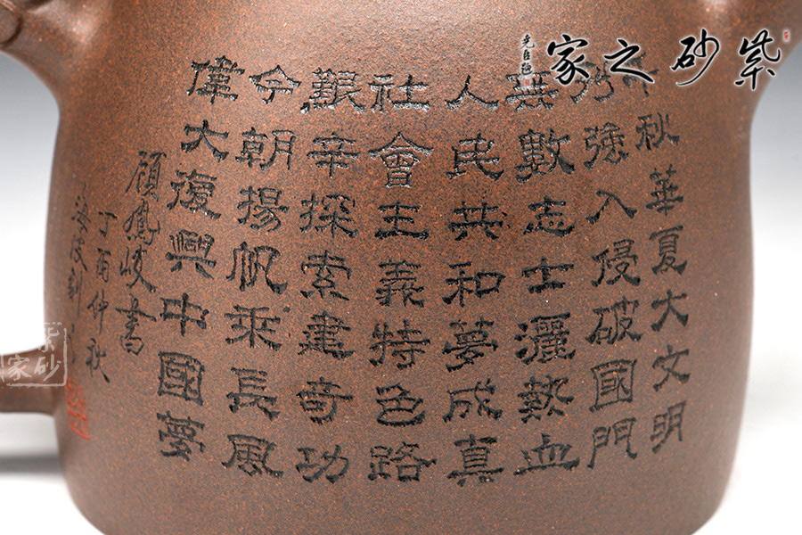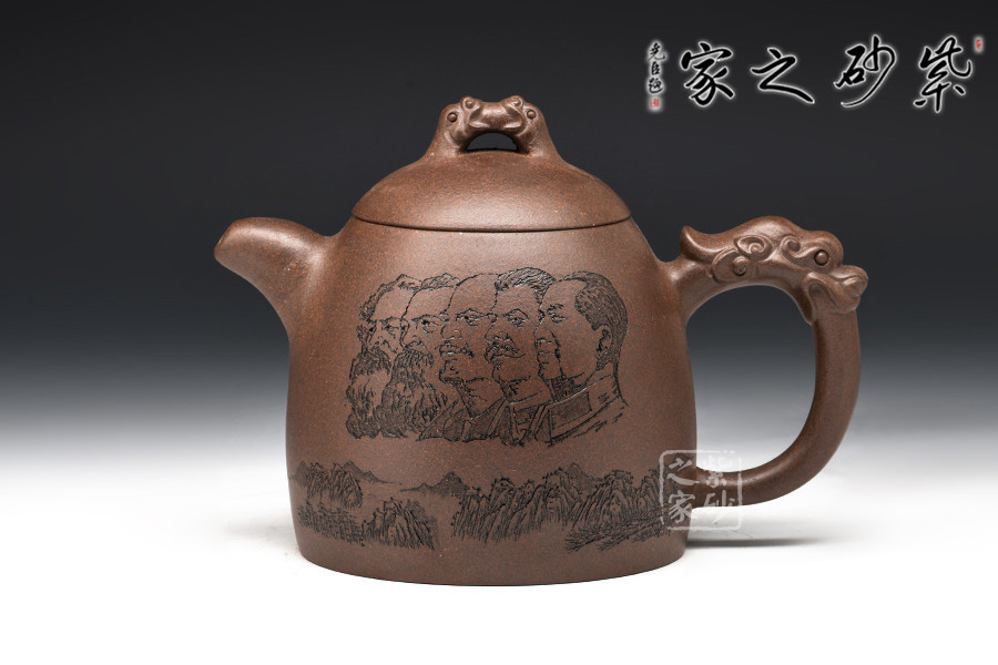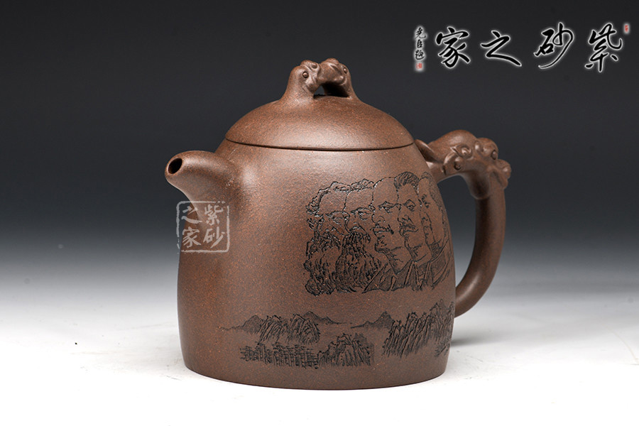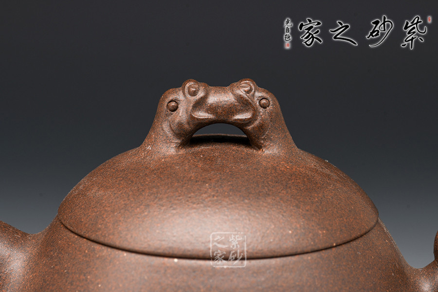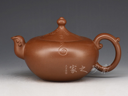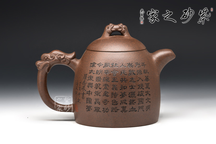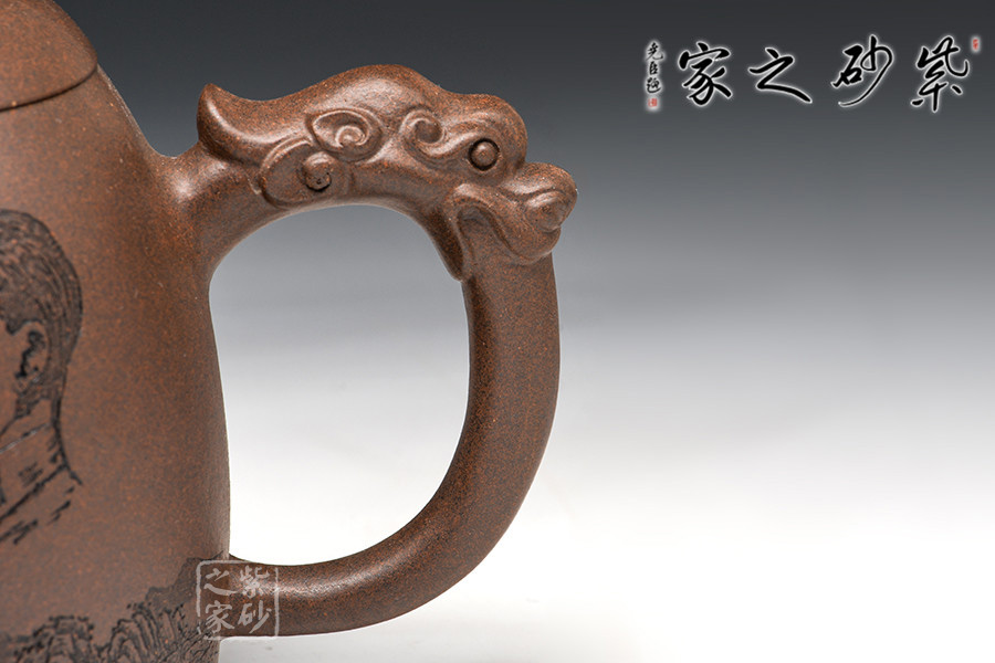 此壺形如其名,整體為秦權(quán)壺型制,一掃六合,掌權(quán)天下。此作在基本秦權(quán)壺型的基礎(chǔ)上,在壺鈕、壺把處增添了龍形元素,“龍吐水”之態(tài),霸氣十足,透著王者風(fēng)范。