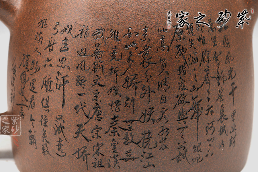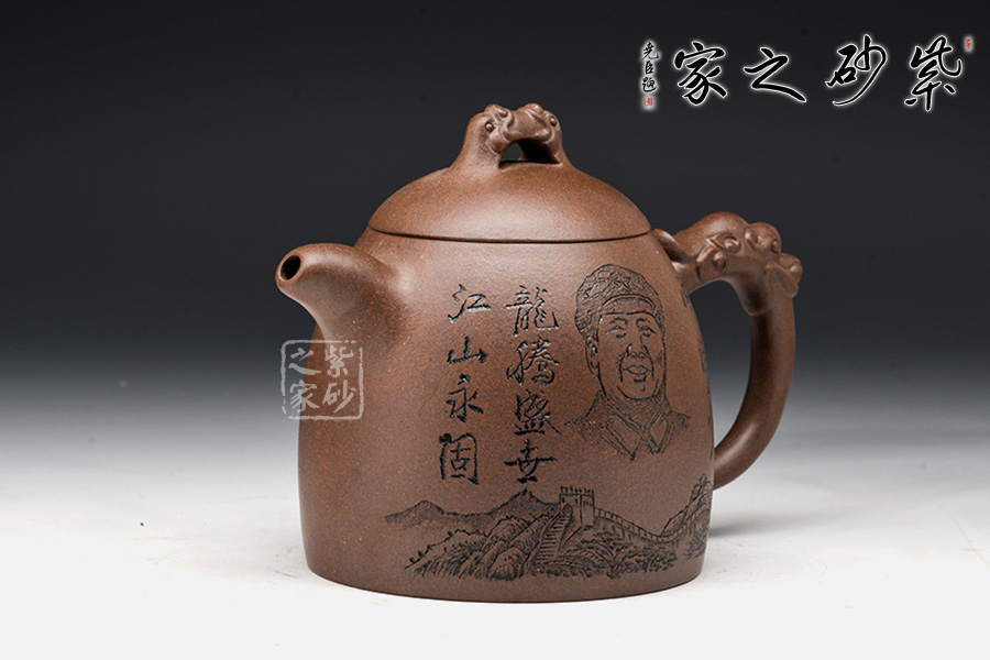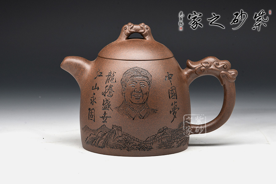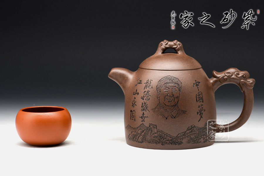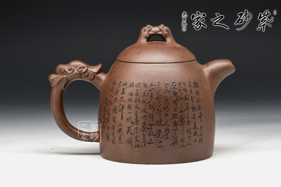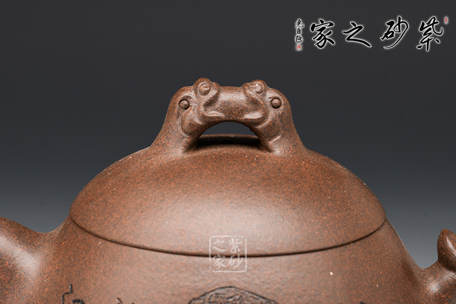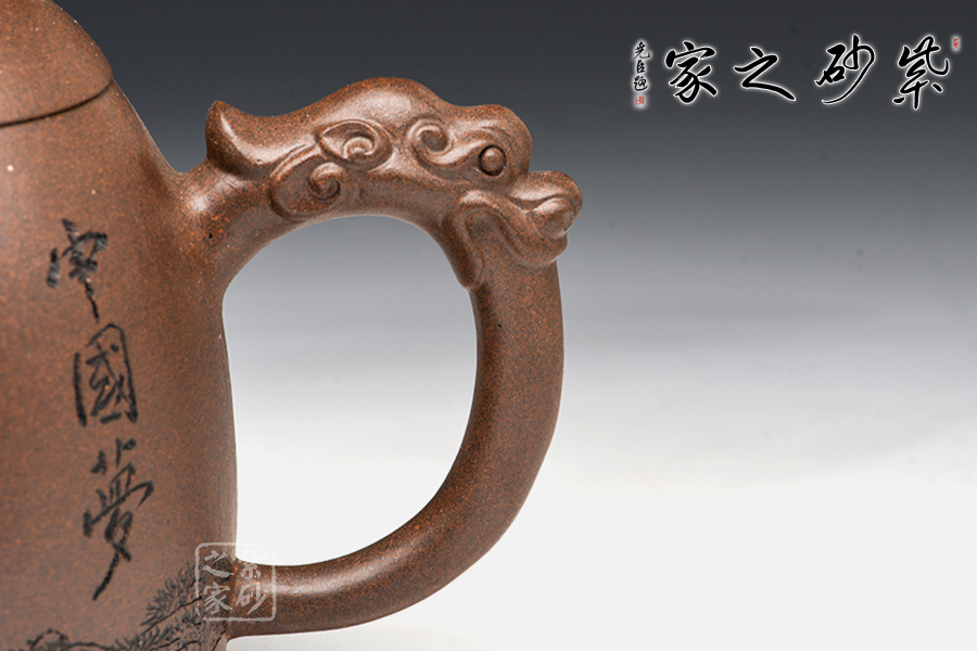 此壺形如其名,整體為秦權(quán)壺型制,一掃六合,掌權(quán)天下。此作在基本秦權(quán)壺型的基礎(chǔ)上,在壺鈕、壺把處增添了龍形元素,“龍吐水”之態(tài),霸氣十足,透著王者風(fēng)范。