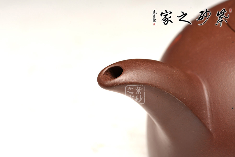 壺式古樸,壺嘴、鈕、把部件的結(jié)合比例和諧,壺身飽滿呈半月形,飛把拿捏舒適,一彎嘴出水利落,乳鈕設(shè)計(jì)精巧。