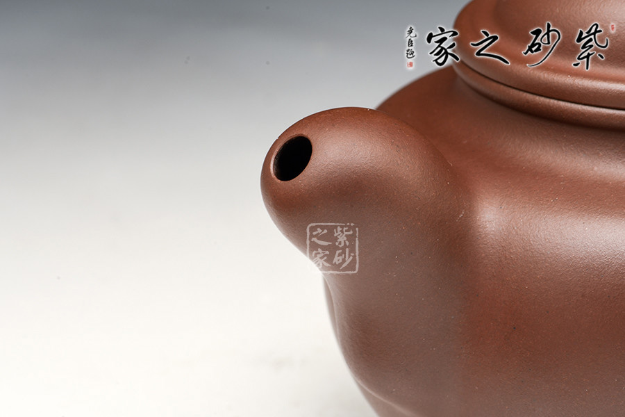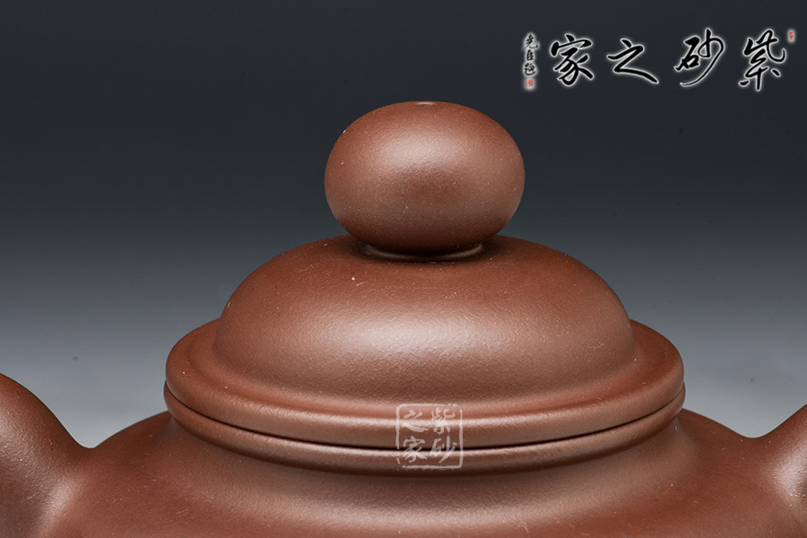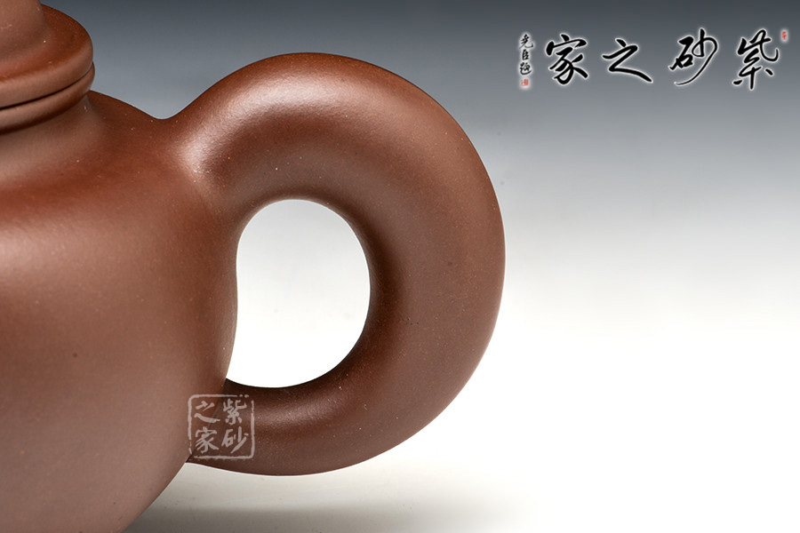 此壺大方高雅,是玩壺品茗的佳選。整器協(xié)調(diào)統(tǒng)一,壺身肩線和足線上下對(duì)應(yīng),中間部分平滑洗練,頸部和底足相互對(duì)應(yīng),更顯氣質(zhì)優(yōu)雅。子母線壓蓋設(shè)計(jì),對(duì)接工整。鼓蓋簡(jiǎn)潔流暢,珠型鈕碩大精致。壺把和壺嘴的造型都很傳統(tǒng),壺把環(huán)形,渾圓厚重,壺嘴彎流,線條簡(jiǎn)單。整個(gè)壺型厚重而不苦悶,優(yōu)雅又不輕佻。