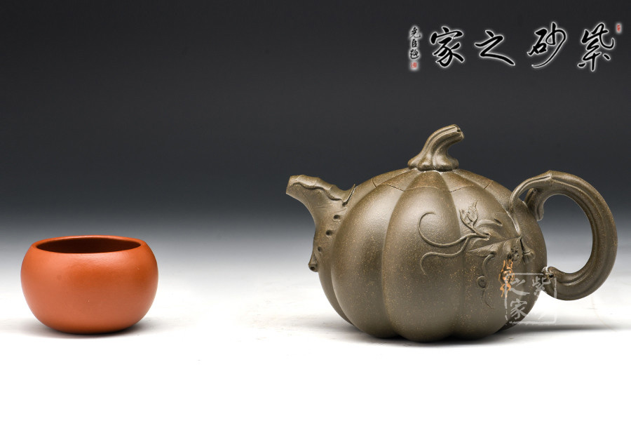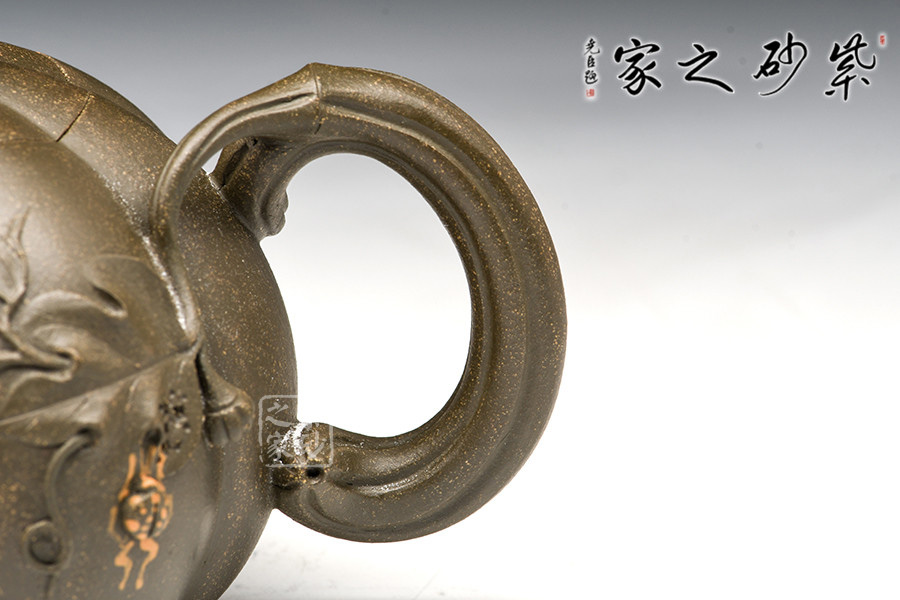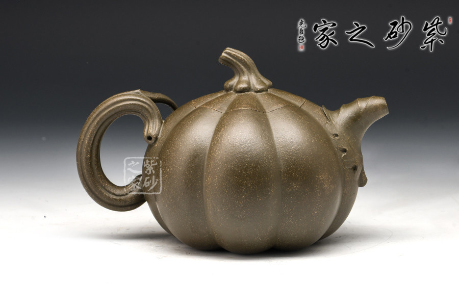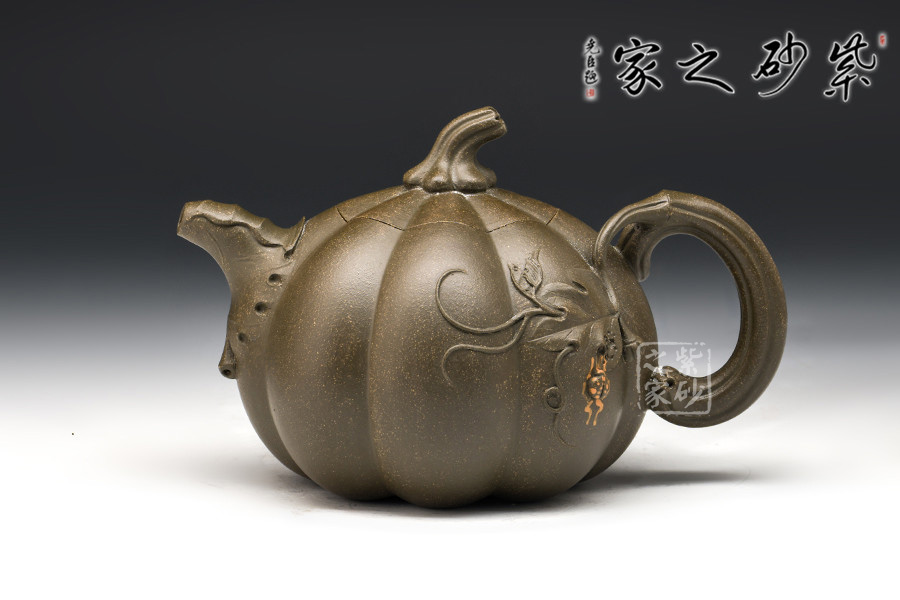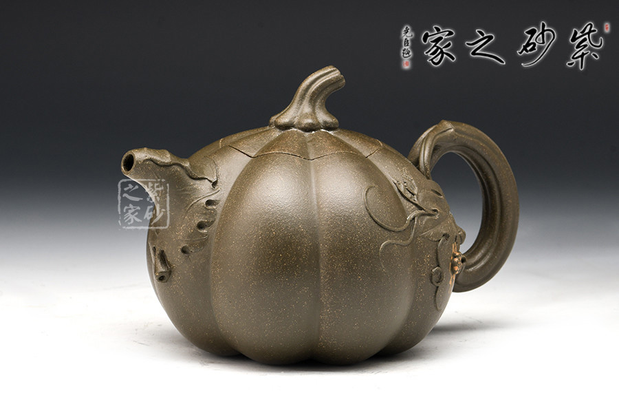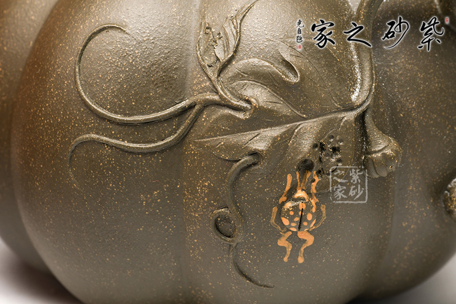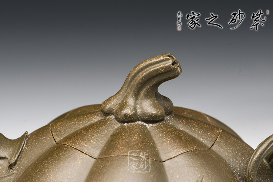 南瓜壺是宜興紫砂壺花貨類經(jīng)典之作,乃紫砂藝人從大自然汲取靈感所創(chuàng)制的壺型,帶有一股來自鄉(xiāng)野的清新活潑氣息,經(jīng)藝人加工,又顯得玲瓏精巧,溫雅可愛。壺以瓜體為身,瓜蒂為鈕,藤為流把,壺身貼塑莖、須、葉,紋絡(luò)逼真細(xì)致,瓜棱勻稱飽滿,蓋與身上下貫通,弧線優(yōu)美,和諧自然。