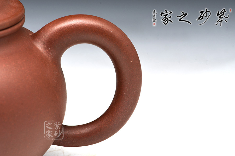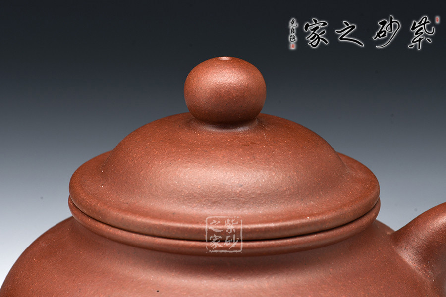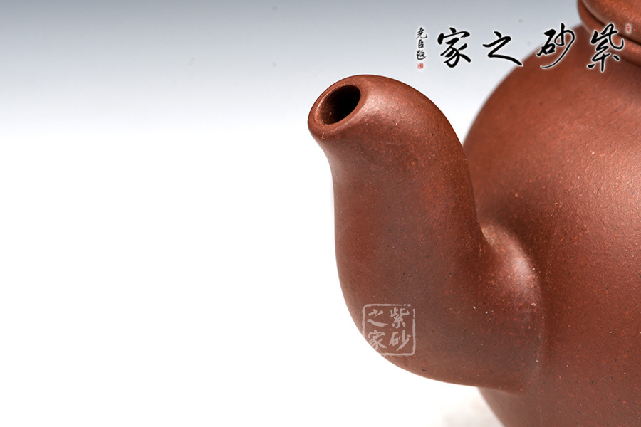 此壺型制類似掇球壺,壺身圓潤豐滿,壺蓋高聳,口沿處出唇,蓋面之上寶珠形鈕引人注目。三彎流、耳形把,各部比例協(xié)調(diào),多一分則累贅,少一分則缺憾。