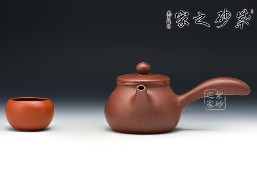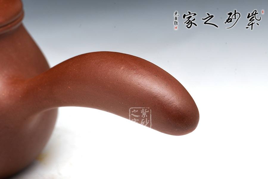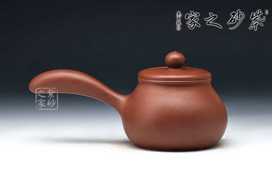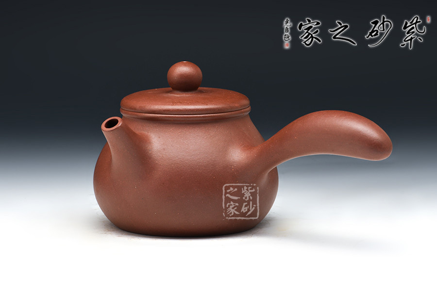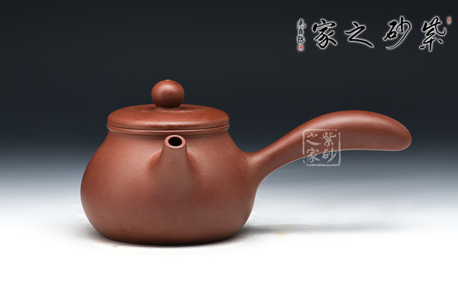 橫把又稱側(cè)握把式,它安裝在壺身一側(cè),和壺嘴成90度角。使用這種茶壺,大約與人的坐著高度有關(guān),若席地而坐,使用橫把比較方便。