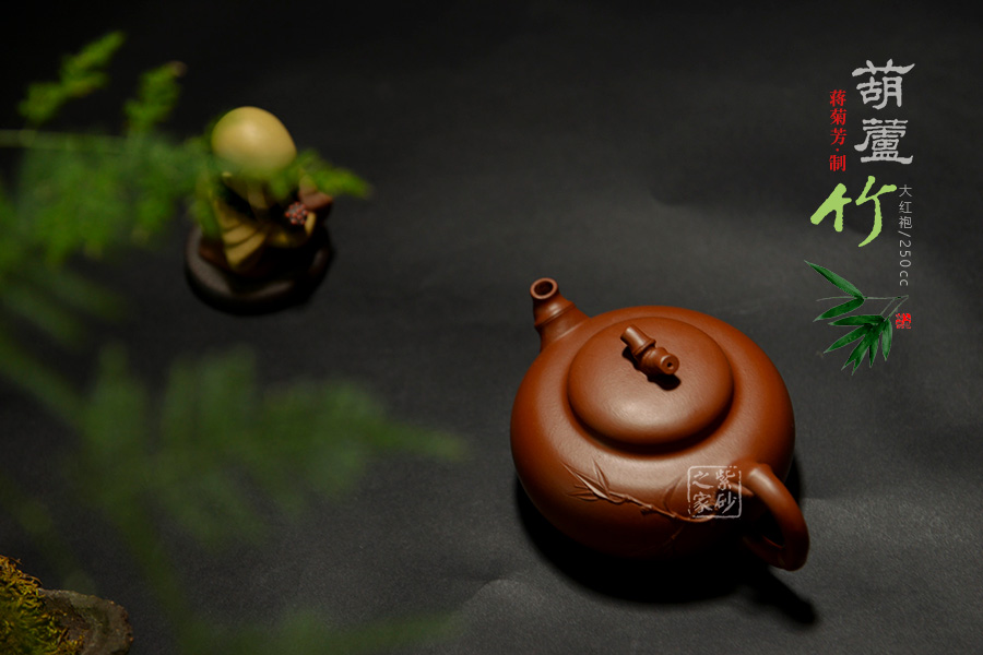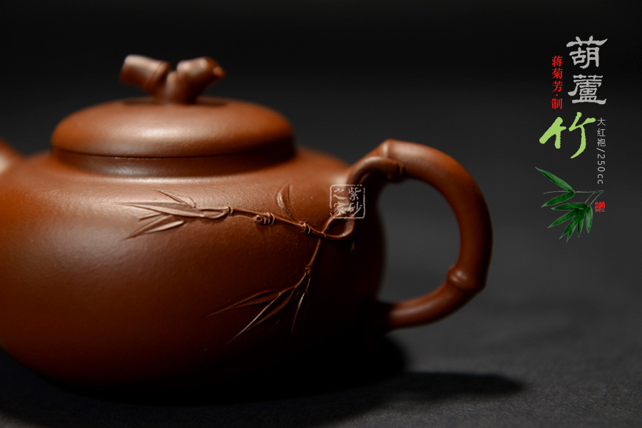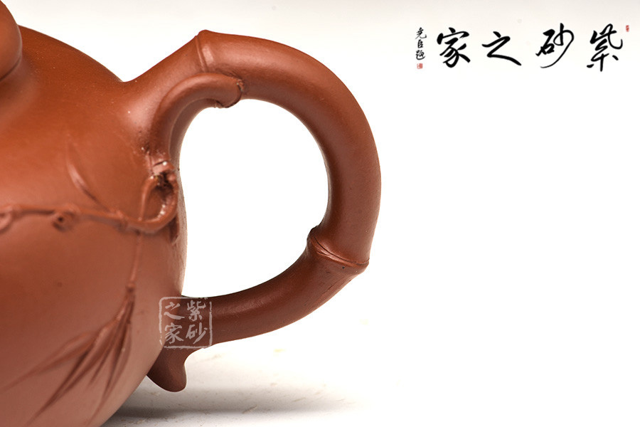 此壺以葫蘆造型為載體襯托竹意,壺身線條飽滿圓潤(rùn),壺蓋微微隆起,壺鈕為兩小竹節(jié)型制,精巧別致,捏拿方便。壺嘴及壺把皆以竹節(jié)塑造為形體,彎曲有致,生動(dòng)形象。壺把緩生而出的嫩葉覆于壺身之上,又顯得清雅有韻。整壺給人吉祥祝福之意,難能可貴!