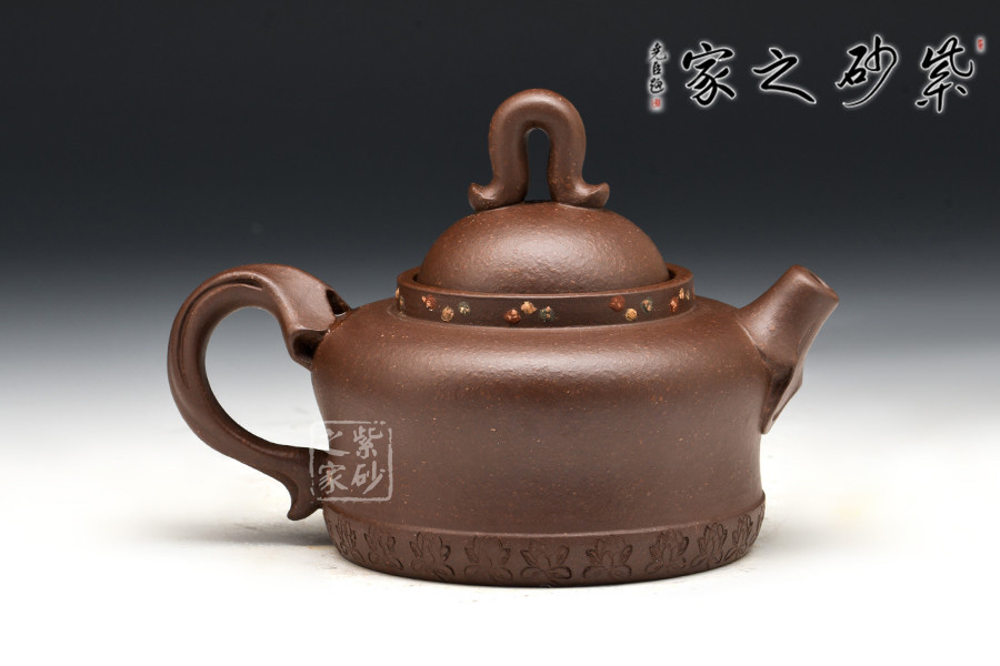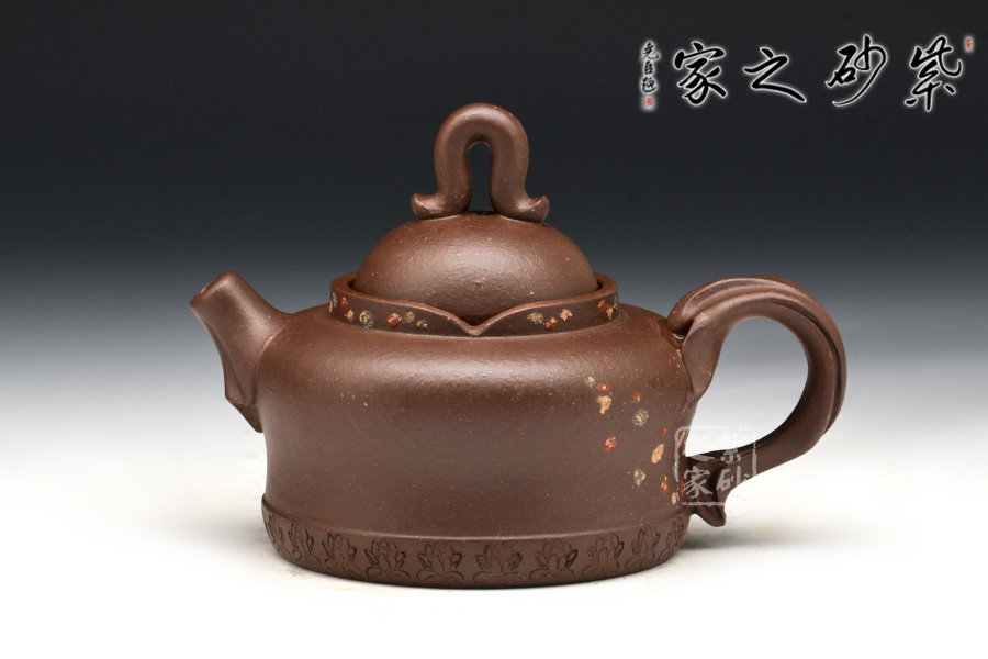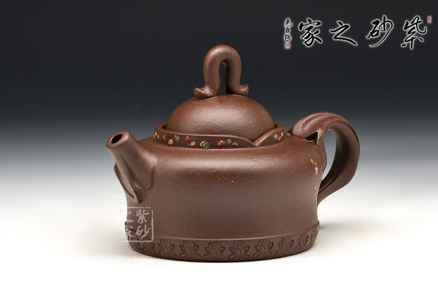壺身大方挺直,豐潤飽滿,以荷花刻繪裝飾壺底,細(xì)膩生動的筆觸,更增添了整器的雅意與韻味。壺頸仿旗袍之立領(lǐng),優(yōu)雅別致,以貼塑花點作為裝飾,及壺身側(cè)面也覆著點點小花,靈秀清麗之姿美妙動人。壺鈕作古代女子發(fā)髻狀,古雅十足,美妙動人,不禁感嘆作者之妙思。壺嘴與壺把皆以婉雅的曲線自然舒展,不囿于形,而走其韻,流動暢然的旋律讓人為之動容。
