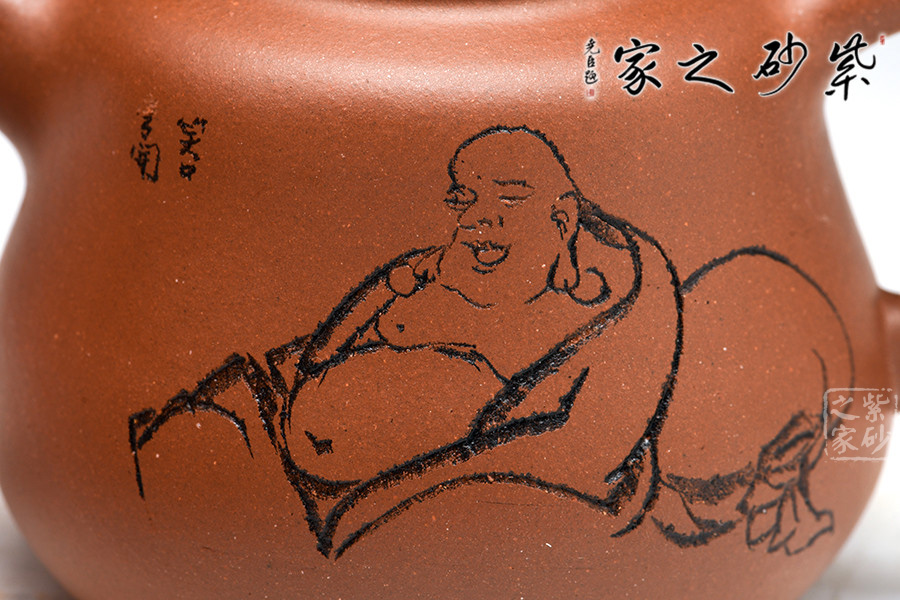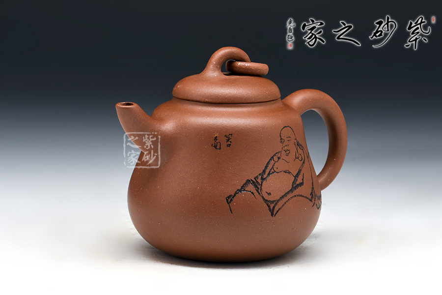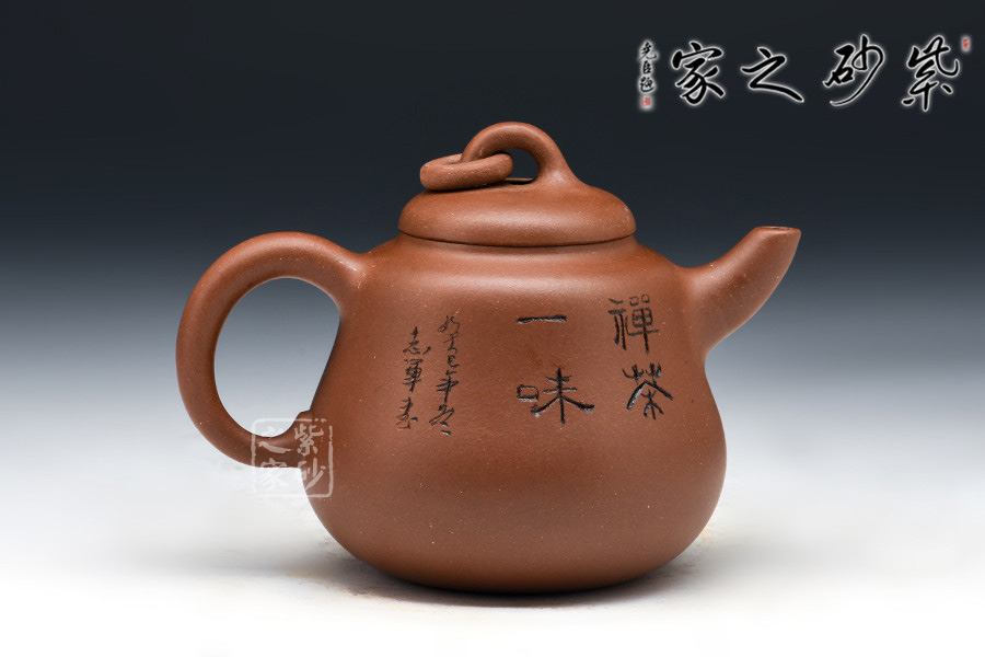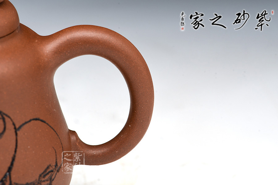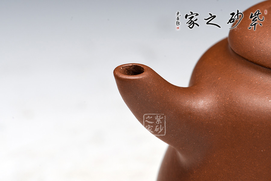 傳統(tǒng)經(jīng)典葫蘆壺,原是曼生壺式之一。整器形制的線條以渾圓為主,十分流暢。壺身收腰,短管流上翹。圓弧把內(nèi)收,骨肉勻挺。截蓋,橋式鈕,內(nèi)嵌活環(huán),靜中有動,動中有靜,靈妙自然,趣味橫生。