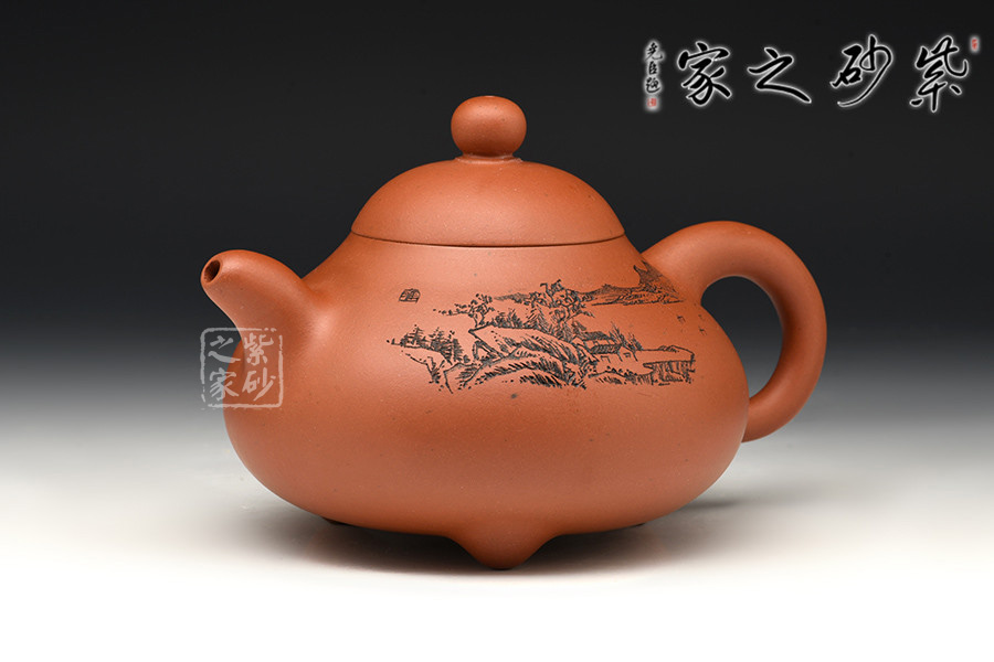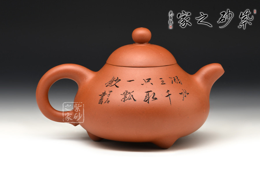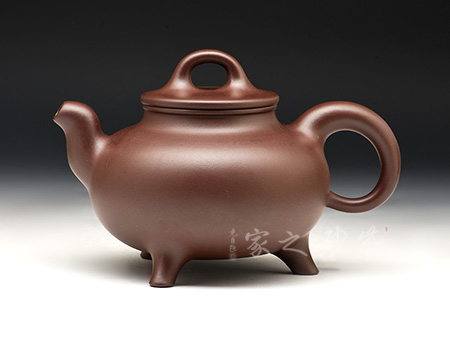 此作壺體呈圓腹、下寬上收,短曲流、耳形柄,乳鼎鈕,各部銜接不見痕跡、光滑自然、渾然一體,流暢的線條強化了律動的視覺效果。底部加置三足,于沈穩(wěn)的壺型中加以縱向的空間感,更古雅清秀。