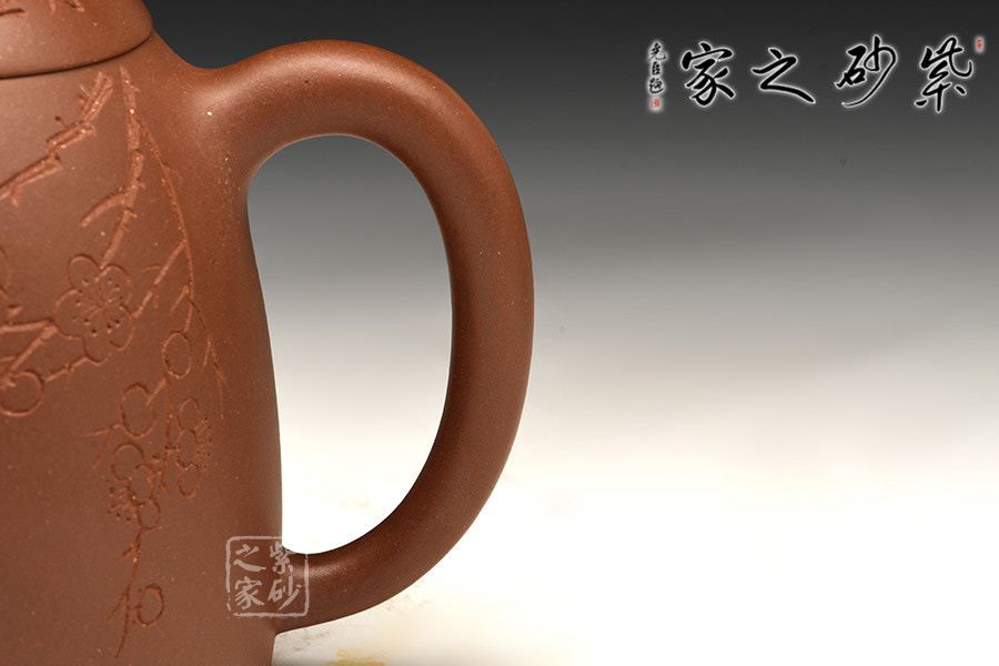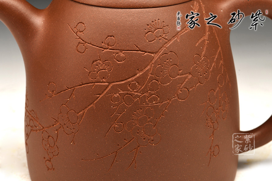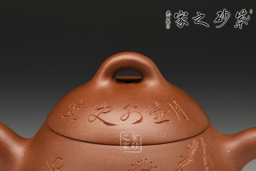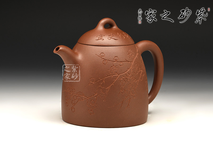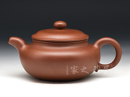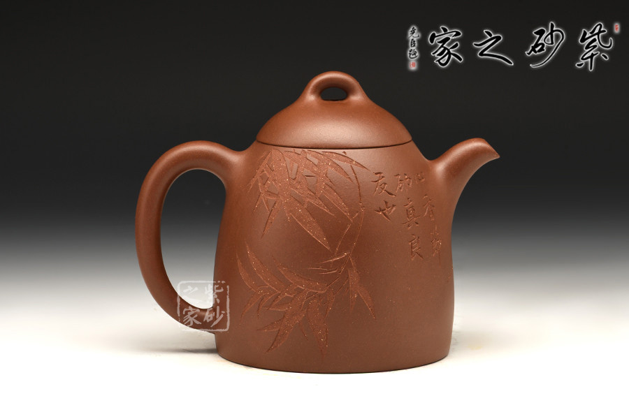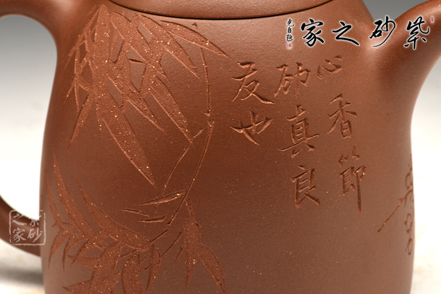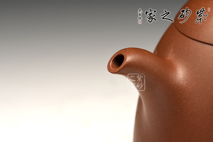 壺身高聳由下至上收斂,自然流暢。流短有勁,不矯不揚。截蓋鼓起,沿與蓋品渾然一本,鈕似橋頂。壺形整體簡練,古樸,大方。